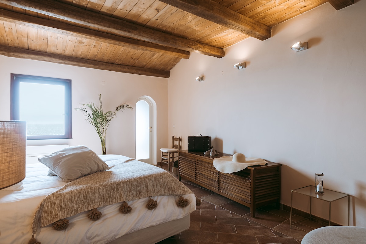På en nivå, kan den rymma upp till 6 personer. Består av två stora sovrum, ett ljust vardagsrum, professionellt kök. Badrummet har två bekväma handfat och ett mycket stort duschutrymme med två duschmunstycken. Stora uteplatser med en köksdel med grill och vedeldad ugn, ett andra utomhusduschbad, en veranda med bord med havsutsikt, avkopplingsområden, gym, 2 pooler, gör det till ett idealiskt resmål för dem som vill uppleva och andas landsbygden och avskildhet i maximal frihet.