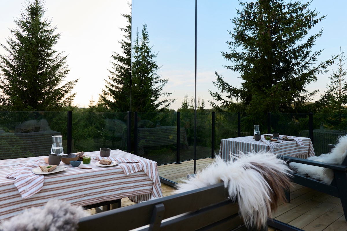 Your perfect romantic getaway at FURU Norway A sheltered south-west facing cabin surrounded by evergreen trees creating an intimate setting. Interior in a dark color scheme, restful like long winter nights. Enjoy your private forest hot tub for 500 NOK per stay, book in advance. Floor to ceiling windows with black-out curtains, underfloor heating. King-size bed, kitchenette with 2-plate cooktop, high quality tableware, comfortable seating area. Bathroom with Rainshower, sink and WC.