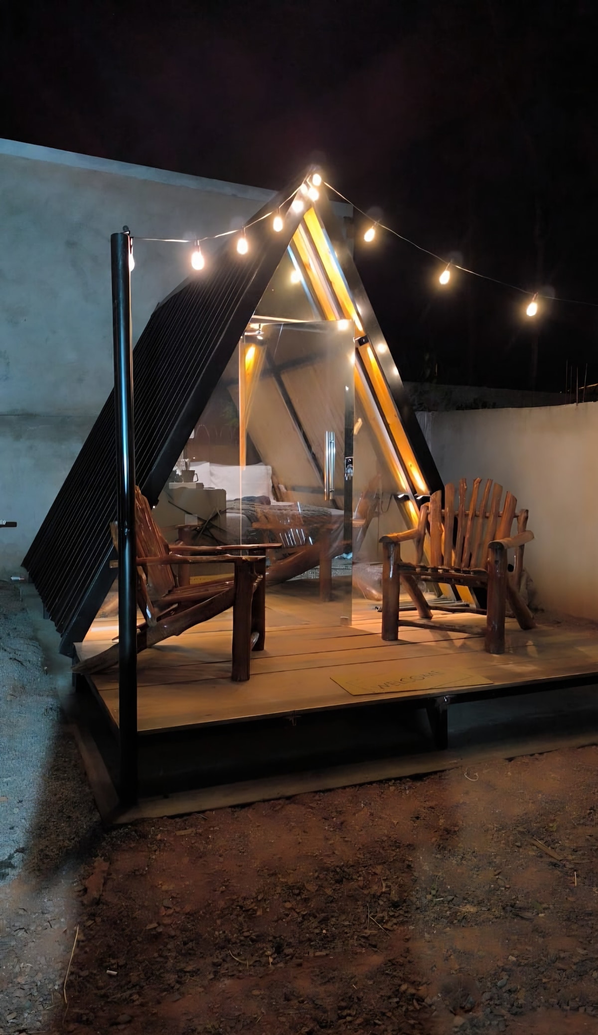 Välkomna till vår charmiga alpstuga i A-ramsstil, där komfort möter naturen. Beläget i en fantastisk miljö omgiven av palmer, erbjuder vår alpstuga den perfekta tillflyktsorten för dem som söker lugn och kontakt med naturen. Njut av en väl inredd inredning, bekvämt vardagsrum, fullt utrustat kök och en perfekt mezzanin för att koppla av. Slappna av i vår trädgård, njut av golvelden under stjärnorna, eller ta ett avkopplande bad i vårt spa.