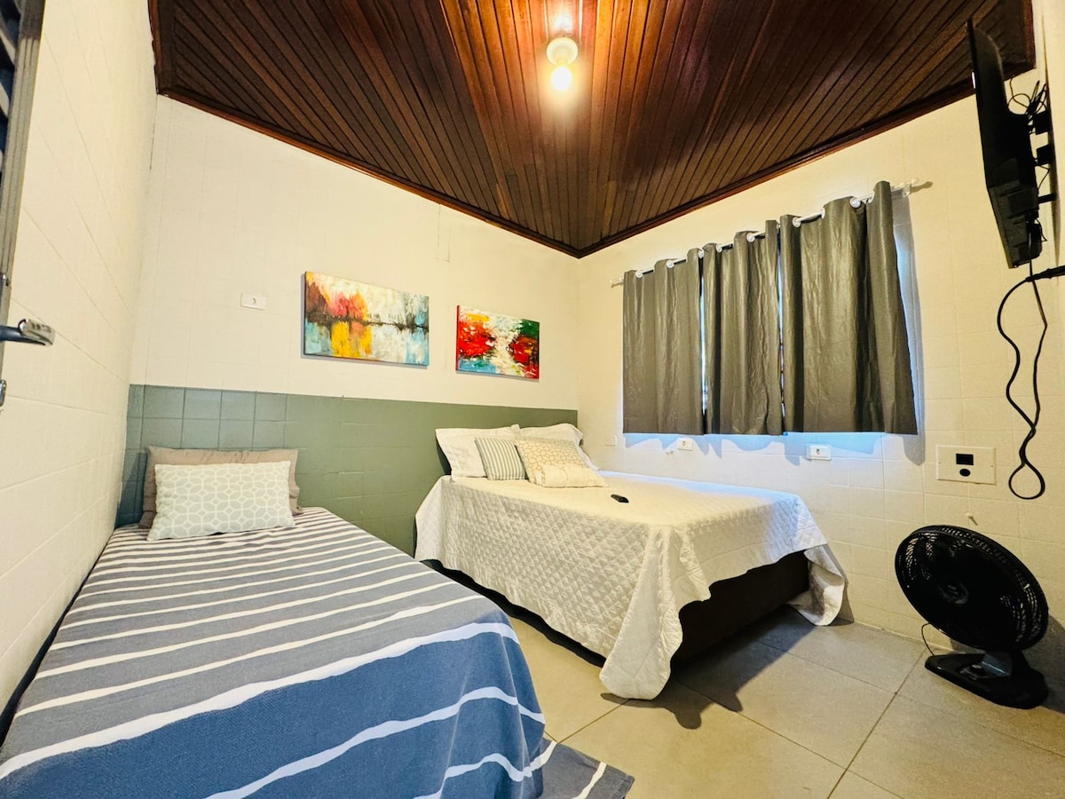 Espaço para casais, cama casal, linda vista para piscina! Cozinha com geladeira duplex, fogão 4 bocas, liquidificador, microondas. Ar condicionado 12000Btu, smart TV 32", internet fibra óptica, ventilador de teto. Piscina compartilhada com demais hóspedes. Presença de cão amigável. Vaga para carro descoberta portão automático. Praias Vermelha do Centro 100m (surf), Tenório 400m(banho) Cedro (banho/mergulho)e Grande (surf/banho)1km. Natureza exuberante. Por favor ler regras da casa e checkin!