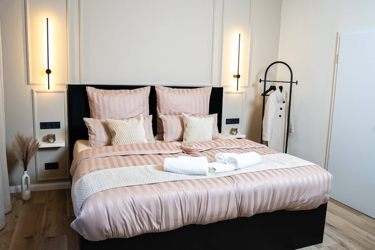 ***Wallbox* ** för att ladda din elbil ***Gratis minibar och kaffespecialiteter *** Studiolägenhet med privat egen wellness-område (timmerbastu, regndusch, hink och avkopplingsstolar). Unna dig en paus och njut av en bastu i den finska bastun eller koppla av med den lugnande värmen av de infraröda radiatorerna. Du kan justera ett mysigt och romantiskt ljusarrangemang med hjälp av belysningskontrollen.