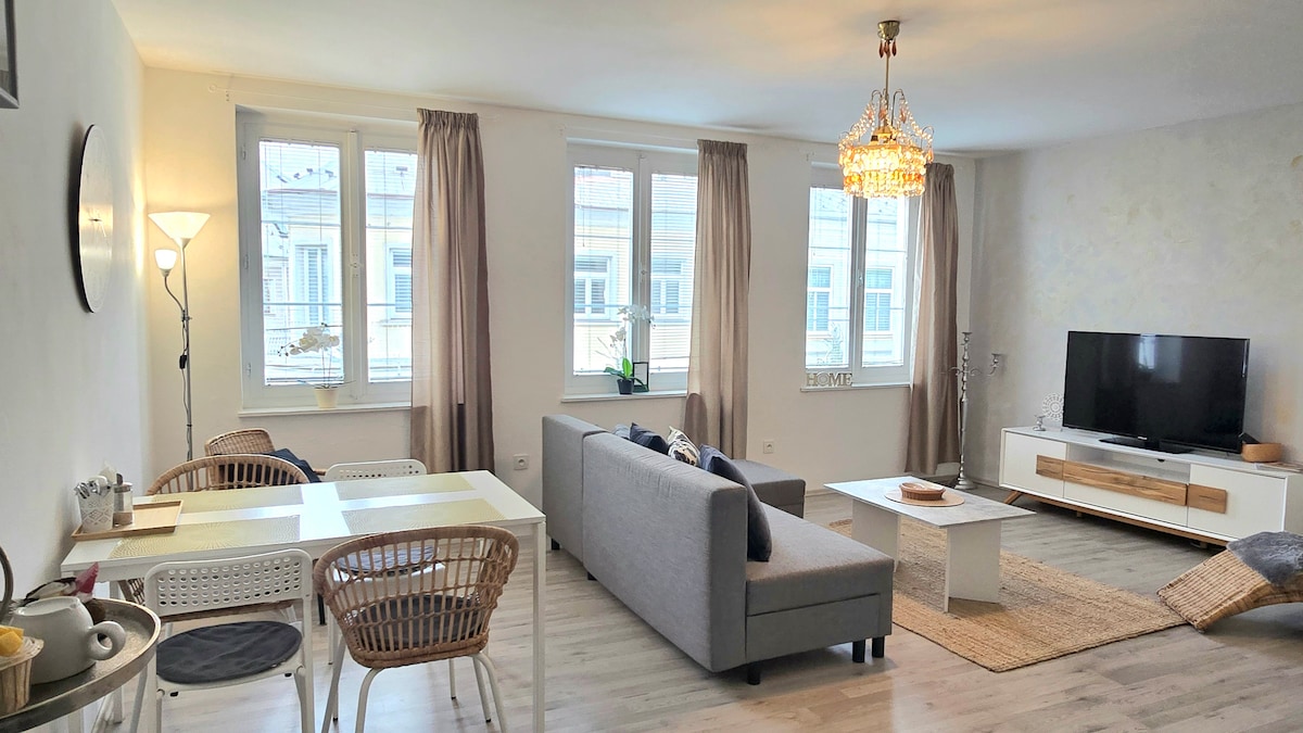 The apartment is exceptional due to its ideal location in the center of Olomouc, in a quiet and prestigious street. It has 2 bedrooms, a living room and a fully equipped kitchen (free tea, coffee, sweets, ...). The bathroom has a bathtub (free hair cosmetics, shower gel, hairdryer, ...) The balcony has a seating area. Toys for children. Free parking in front of the house. The perfect place to relax and discover the history of the city. Free wine or sparkling wine with a stay of two nights 🍷