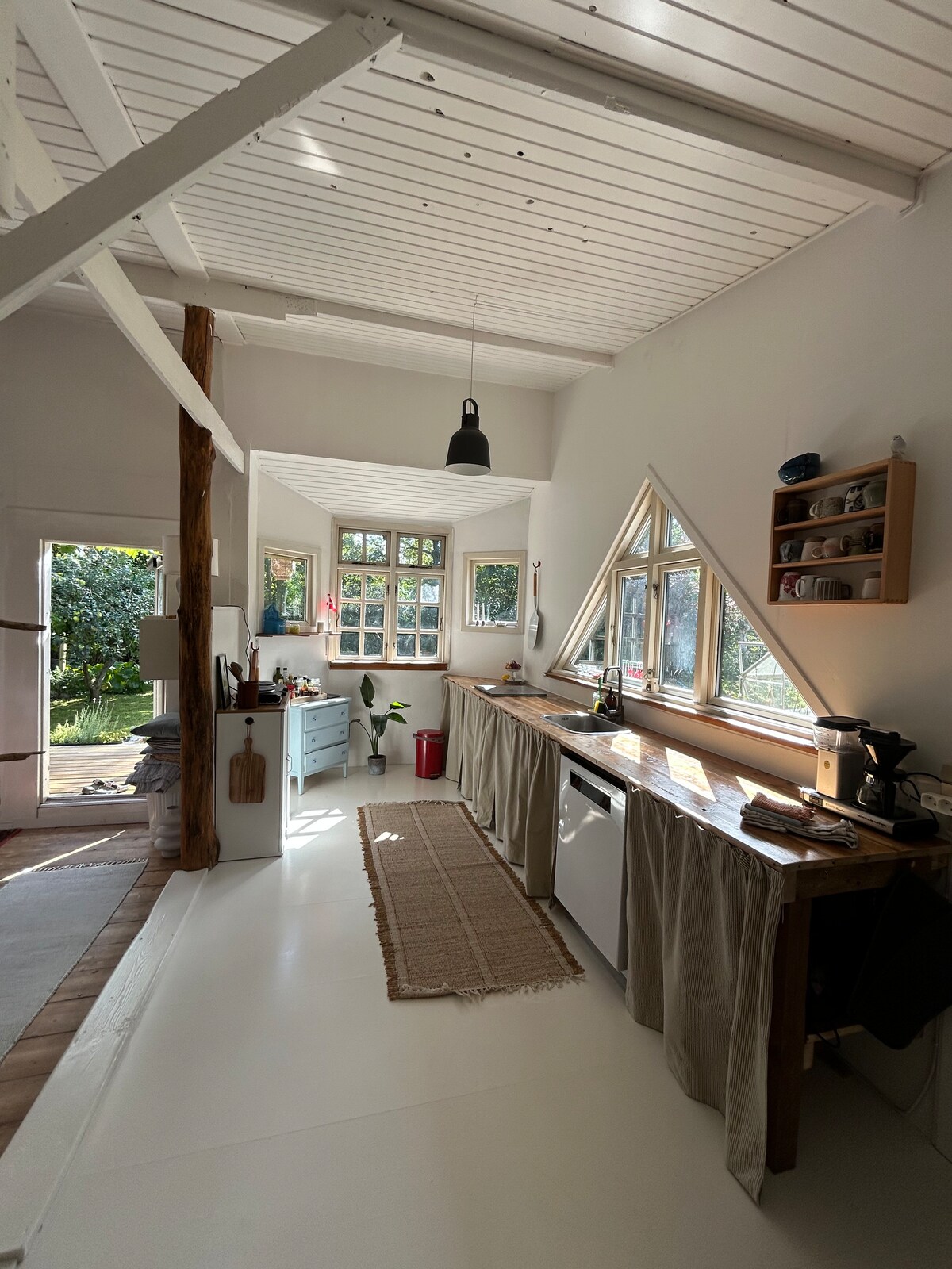 Hyggeligt, charmerende og skørt fritidshus i Blegind. Et hus med mange finurlige løsninger. Huset ligger tæt på storby, natur og vand. Huset ligger solrigt, har en overdækket terrasse og en stor have. Huset har et badeværelse, stort køkkenalrum, to soveværelser og en hems. Huset har ikke døre til værelserne. Der er ingen ovn, men en airfryer. Der er både havespil, puslespil og brætspil. Der er brændeovn og en varmepumpe. Sengelinned og håndklæder er inkluderet.
