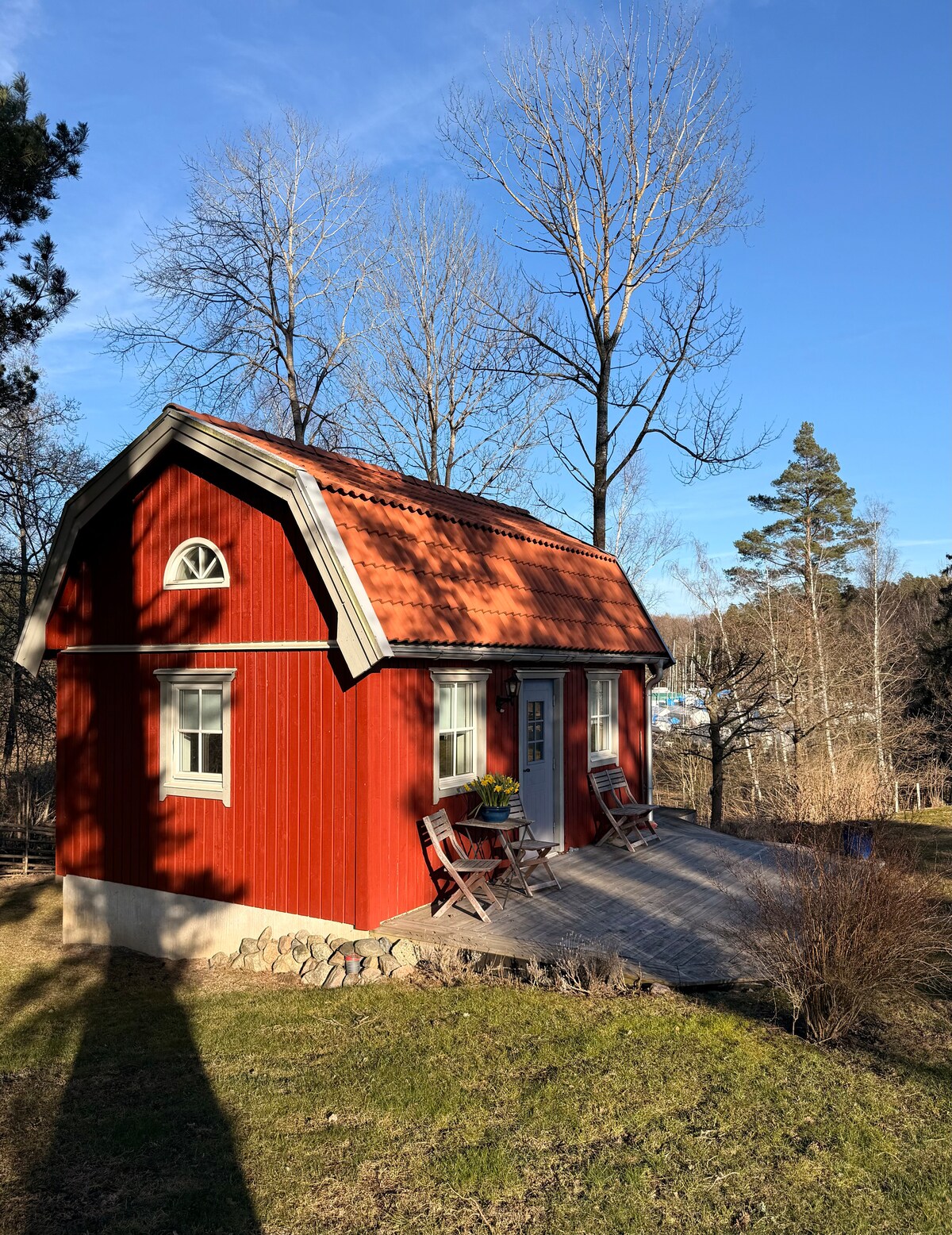 On our premises, we have a genuine village bakery house from the 18th century. Modern standard in a country style atmosphere, with a bathroom, kitchen and sleeping loft for two. Private entrance and a veranda for evening dinners. This is a great base to explore the area either by foot, locally, or by car across the Archipelago. Stockholm by ferry was so easy. If you want to self-cater, the supermarket is only 3 minutes walk away