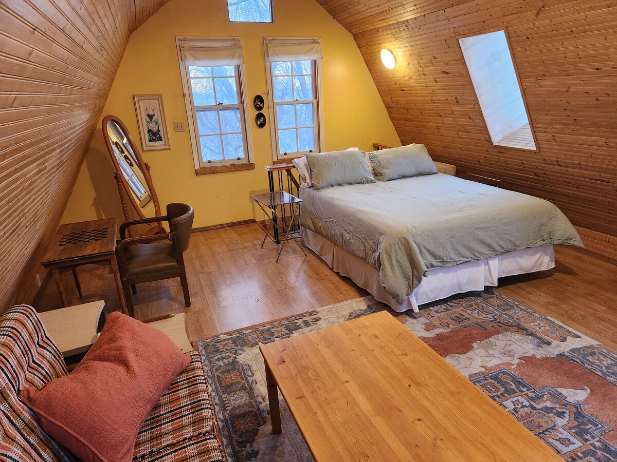 This is the primary rental suite at the Dragonfly Inn. The loft suite is a fully independent legal suite with its own entrance, kitchen, laundry, heating, bedroom and TV room. The suite has its own heating and cooling systems. The loft suite can comfortably sleep 4 adults. There is a queen bed in the bedroom and queen sofa bed in the TV room. Twin bed's can also be set up for kid(s) instead of the sofa bed (max 200lbs). We also have pack and play for toddlers.