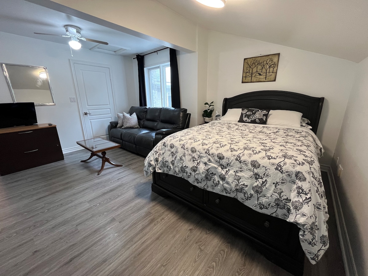 Have a comfortable and relaxing stay in this brand new, fully furnished private basement apartment. This clean, pet-free and smoke-free unit has just been completely renovated. This modern space includes one private bedroom, one gorgeous bathroom, a fully equipped workstation, a kitchen table and eating area, and 60” flat screen TV with a firestick. We want you to have a smooth and relaxing guest experience, and we are available by phone or text 24/7.