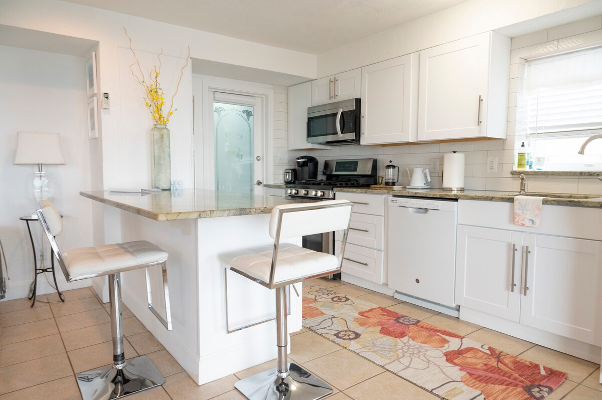 Kom och ha kul på The Coastal Cottage. Detta nyrenoverade boende ligger bara en minuts promenad från din privata strand och är huvudvåningen i boendet. Gå in i det bekväma vardagsrummet, med boho-vibbar och en stor sektionssoffa. Ett sovrum har en Queen säng, det andra har en full och dubbel våningssäng och en spjälsäng. Njut av det stora köket med stort matbord, frukosthörna och massiv granitö. Njut av grillning, utomhusduschen eller häng på gården för att koppla av med familj och vänner.