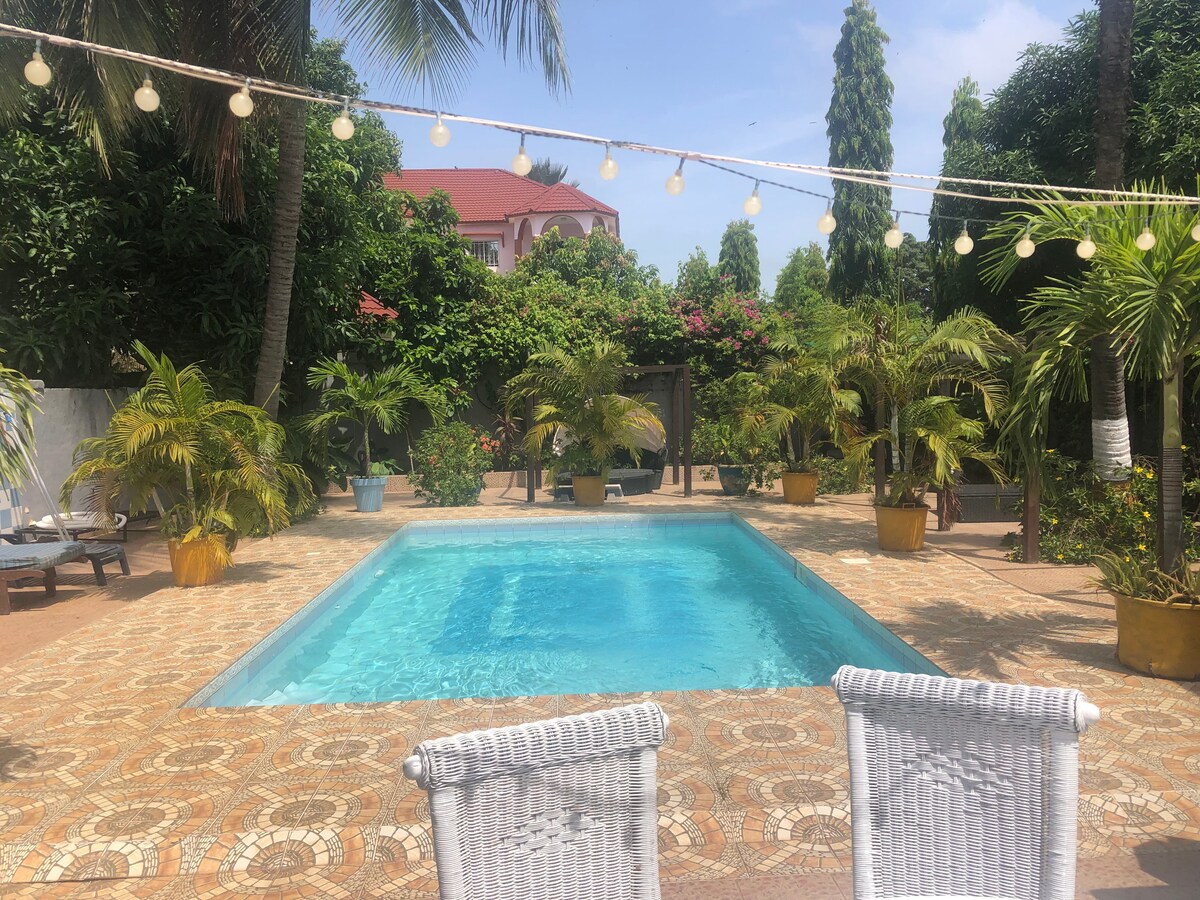 Luta dig tillbaka och slappna av i detta lugna, eleganta utrymme. Vår studiolägenhet är fullt utrustad med pentry, WiFi, luftkonditionering och ett rymligt duschrum. Trädgården och poolområdet är en vacker plats för avkoppling och lyssna på fåglarna. Takterrassen och baren är ett fantastiskt ställe att njuta av solnedgången. Vår förening ligger några meter från Brusubi motorväg med sina snabbköp barer och restauranger. Vi är en kort bilresa till Senegambia Strip och bara 1 km promenad till de härliga stränderna i Bijilo.