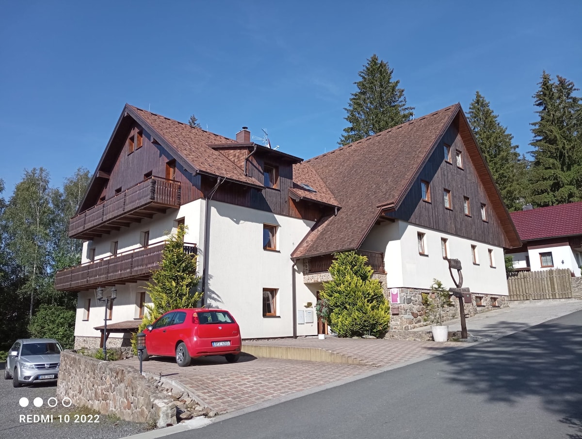 Hitta ett mysigt andra hem i en bekväm lägenhet för 2-4 personer och njut av en välförtjänt några dagar i hjärtat av Šumava. Njut av lugnande utsikt från uteplatsen eller direkt från den uppvärmda sängen och upptäck de vackraste platserna i naturen. Platsen på luften ligger i utkanten av naturreservatet Brčálnicke Wetland, du kan gå till den mest kända Černý och Devil 's Lake och du kan nå vinterorterna på den tjeckiska och tyska sidan. Parkering för din bil är en självklarhet, men du kan också anlända med tåg.