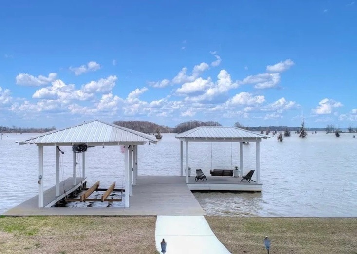 Specialdesignat hem vid sjön med 12 fots tak, stor avskärmad veranda med vacker utsikt över sjön och solnedgångar, ny gunitpool, brygga med soldäck och täckt område, öppen planlösning, gaskamin, inlagda hjärtformade skåp i kök och badrum, Cypress köksö med sittplatser, walk-in garderober och en suite lyxiga badrum som ger varje gäst integritet och komfort, fantastiska arkitektoniska detaljer och möbler, välvt tak, antika balkar och eleganta armaturer i sovrummet.