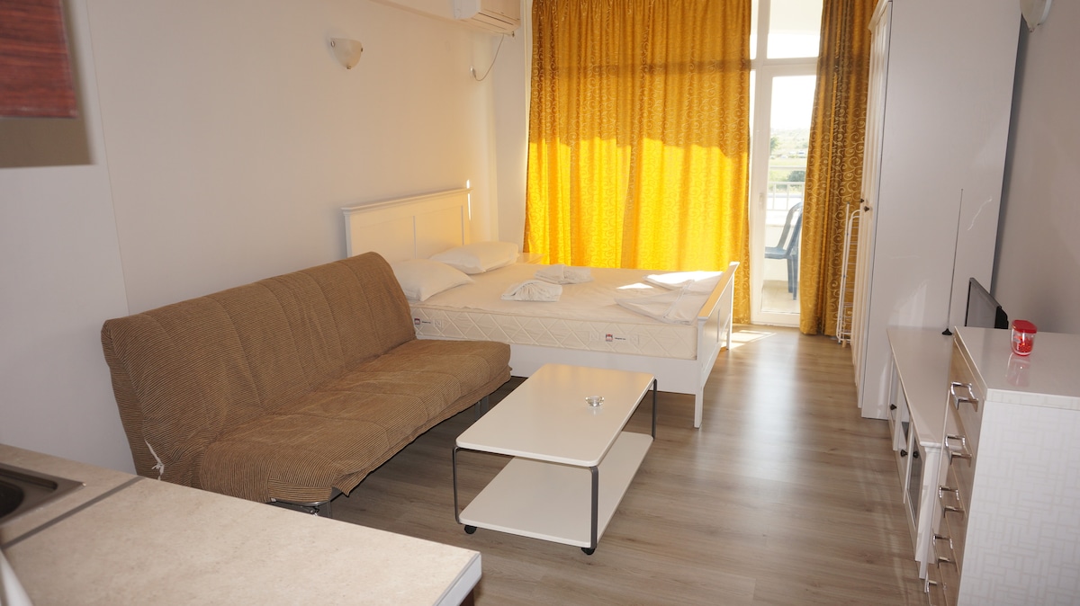 4-person apartment with a balcony facing west. Living room with kitchenette with ceramic hob, oven, Dolce Gusto capsule machine and undercounter refrigerator, large flat-screen TV and sofa bed in the living room. Bedroom with 2 large wardrobes and flat-screen TV, bathroom with bathtub and hairdryer. Central air conditioning divided into rooms. Spacious balcony. Unlimited WIFI.