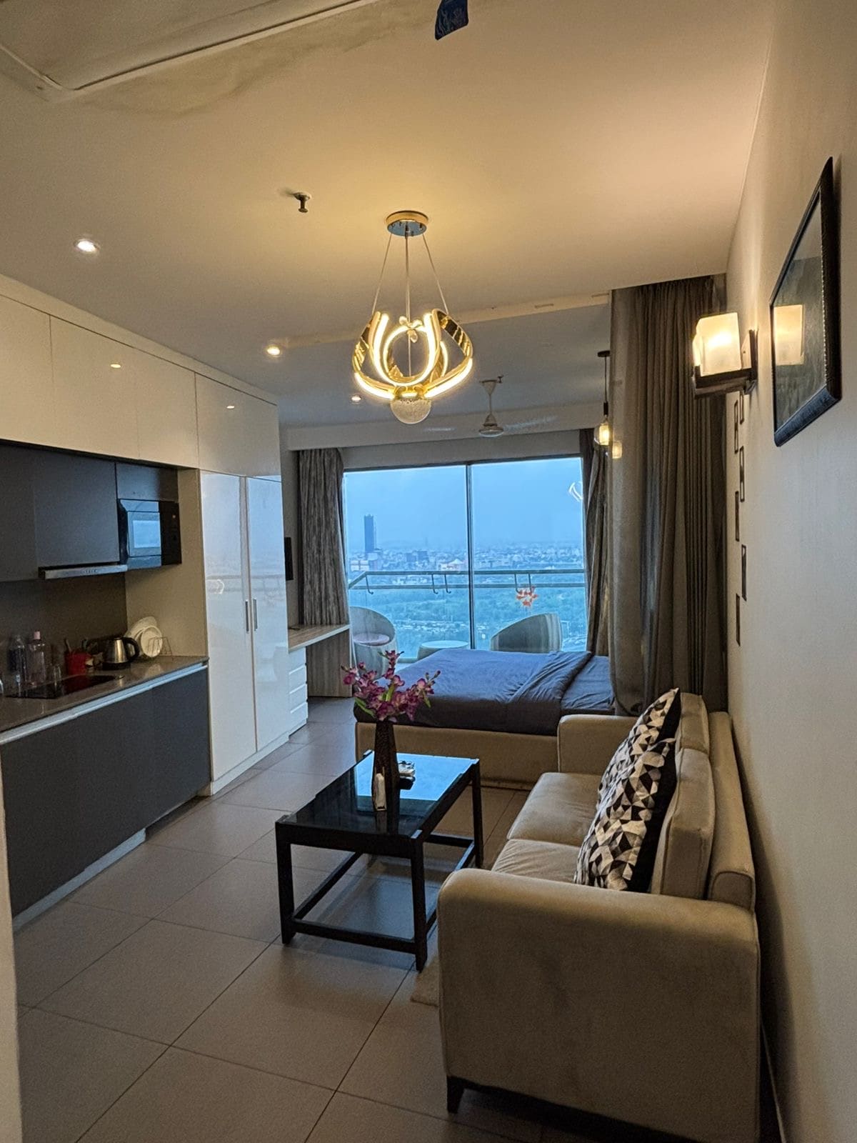 Vi presenterar vår utsökta lyxiga studiolägenhet: Denna överdådiga studio ligger i hjärtat av staden och har modern elegans och oöverträffad komfort. Den öppna designen bjuder in dig till en rymlig fristad, badad i naturligt ljus från de stora fönstren som erbjuder fantastisk stadsutsikt. Denna lägenhet ligger på 41:a våningen i en av de högsta skyskraporna i Delhi — NCR. Lägenheten har utsikt över floden från balkongen!!