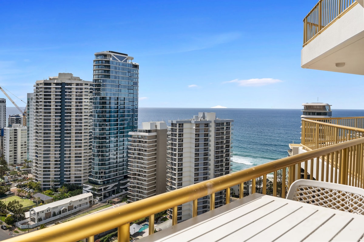 Fly till denna eleganta, nyrenoverade studio med havsutsikt i hjärtat av Surfers Paradise. Vakna upp till fantastisk utsikt från din privata balkong på 29:e våningen, fullt utrustat kök, modernt badrum och vardagsrum. Dra nytta av resortens bekvämligheter: inomhus-/utomhuspooler, spa, bastu, gym, spelrum och tennisbana. Säker parkering ingår. Bara en kort promenad till stranden, Cavill Avenue, restauranger, nattliv och transport — perfekt för både avkoppling och äventyr på Gold Coast.