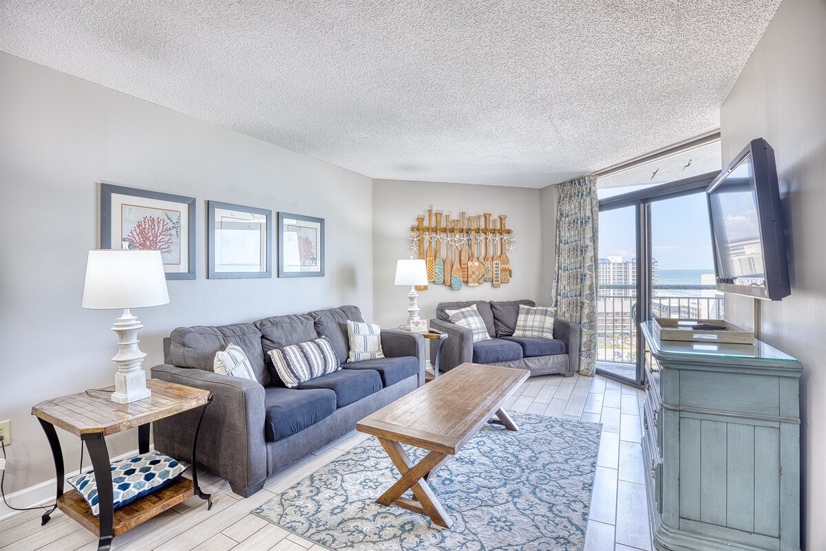 Upptäck Salty Waves 🌊 din ultimata direktflykt vid havet! Denna eleganta lägenhet på 11:e våningen erbjuder hisnande direkt strandutsikt och rymmer upp till 4 gäster i total komfort. Njut av ett fullt utrustat kök, plysch king size-sängkläder och kustinspirerad inredning bara några steg från Myrtle Beachs främsta sevärdheter. Som passionerade Superhosts har vi tänkt på varje detalj för att leverera en riktig ⭐⭐⭐⭐⭐ vistelse. Boka nu för solsken, lugn och stil! (Inga husdjur, rökning eller motorcyklar 25+) Utrustad med strandtillbehör.