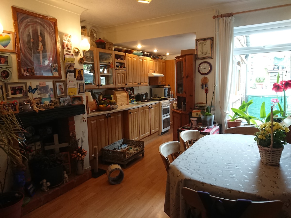 Litet radhus, med liten trädgård, hemifrån. Nära till centrum och järnvägsstationen, promenader på landet. 40 minuters tåg till London och bra för andra platser. Husdjur: två hus/trädgårdskaniner och Lucy Dog alla vänliga. Gäster kommer och stannar hela året. Perfekt för vistelser på universitet och företagspark, för personer som inte vill ha 5-stjärnigt hotell, men familjehem, är det värdarnas hem som delas med dig. Checka in mellan 15:00 och 21:00 och lämna senast 11:00.