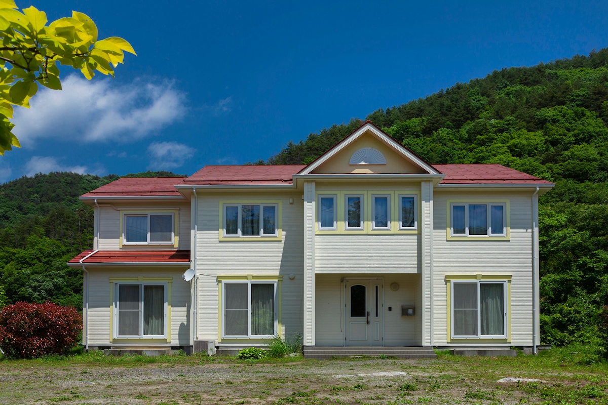 Beläget i Yatsugatake, Nagano,känd för sin vackra natur och är också en populär semesterplats. Vår villa är 650 kvm och har en 2 tunnland trädgård. Vi har 6 sovrum, 2 duschrum, ett rymligt vardagsrum för att koppla av.Piano, karaoke är tillgängliga för din underhållning! Golf, vandring, varm källa, paragliding, ridning och skidåkning är bara några aktiviteter du kan njuta av. Vi rekommenderar att du hyr en bil i förväg. Det är en 20 minuters körning från JR Kobuchizawa sta.