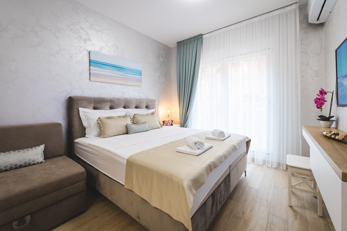 Denna studiolägenhet har en dubbelsäng och en soffa, fullt utrustat kök och det finns också en garderob med galgar. Vi tillhandahåller sängkläder på varje säng. Fräscha upp dig i mysigt badrum, och alla nödvändigheter vi tillhandahåller. Soffan kan användas för utdragen säng för en vuxen person eller två barn. På den möblerade terrassen kan du njuta av ditt morgonkaffe. Vi erbjuder gratis Wi-Fi i alla lägenheter och kabel-TV på platt-TV. Vi erbjuder gratis parkeringsplats framför byggnaden.