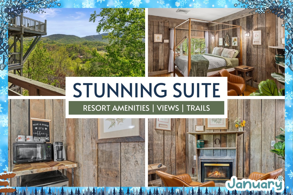 Du kommer inte vilja lämna detta charmiga, unika ställe. Blue Ridge Suite har en privat balkong och ingång eller använd huvudingången på vår stora uteplats. Sviten är utrustad med ett fullt utrustat kök och kylskåp i full storlek. En vacker queen size säng och en bäddsoffa. Koppla av framför brasan i dina söta små fåtöljer. Njut av utsikten från sängen eller din privata balkong. Njut av den fyllda gratis kaffebaren i Great Room.