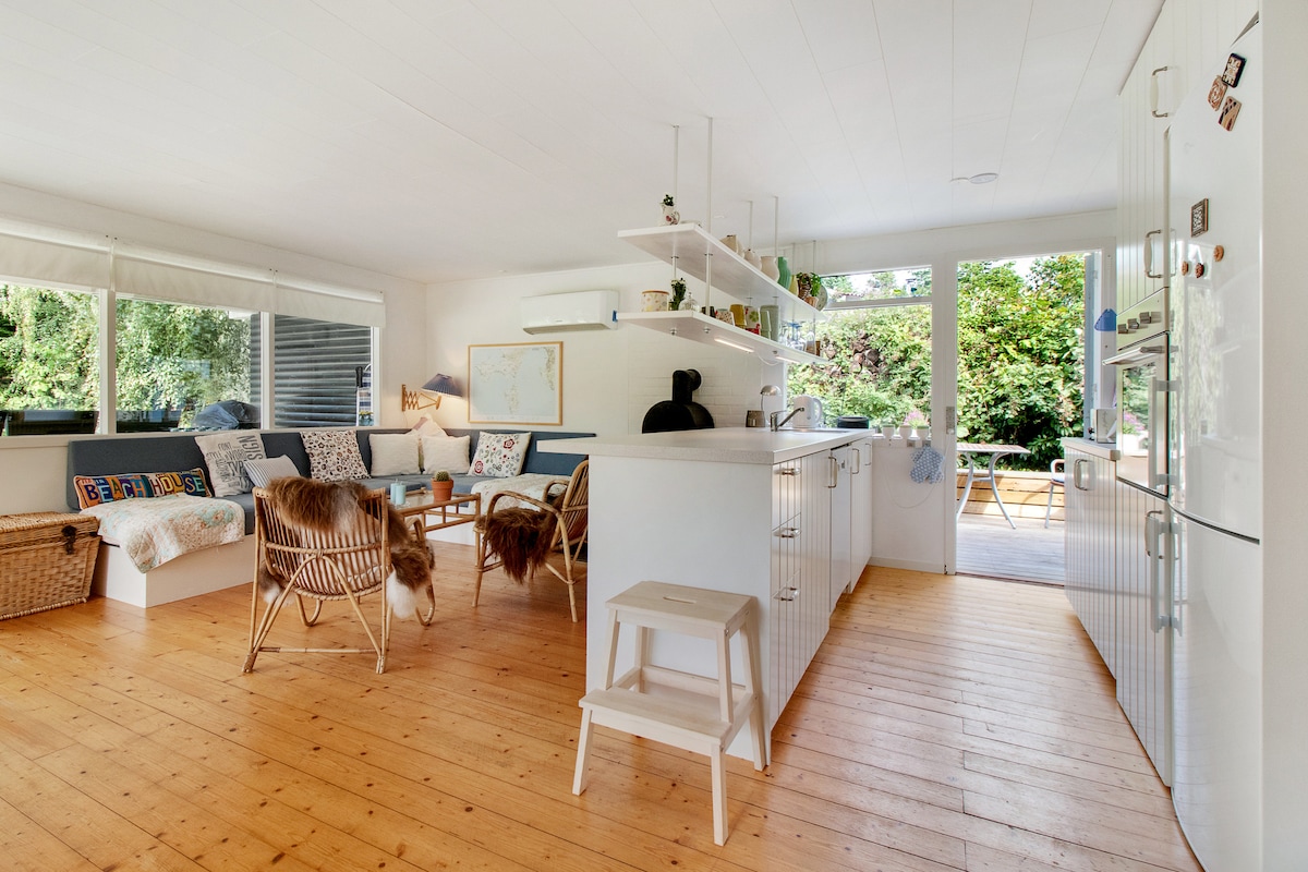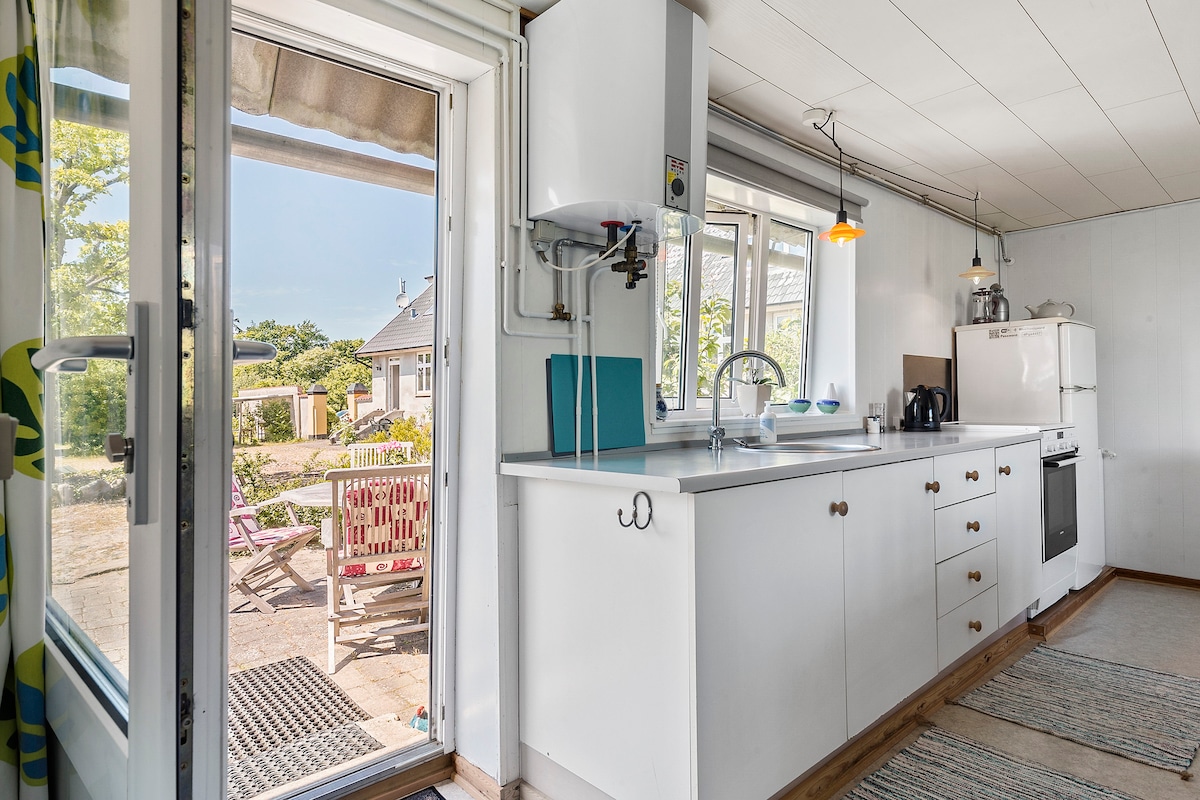 Vi har förberett scenen för att du ska njuta av en vistelse i "stugan" och vill ge dig en unik upplevelse. Om du gillar natur och tystnad är stugans 30 m2 plats för dig. Rikt djurliv och avskilt läge. Den stora TV: n inbjuder till filmkväll, terrassen inbjuder till middag utomhus och omgivningen inbjuder dig att begrunda och närvara. Nytt 2024 - täckt terrass med direkt utsikt över fält och bra skydd. Kort avstånd till skog, golfbana, stad och strand.