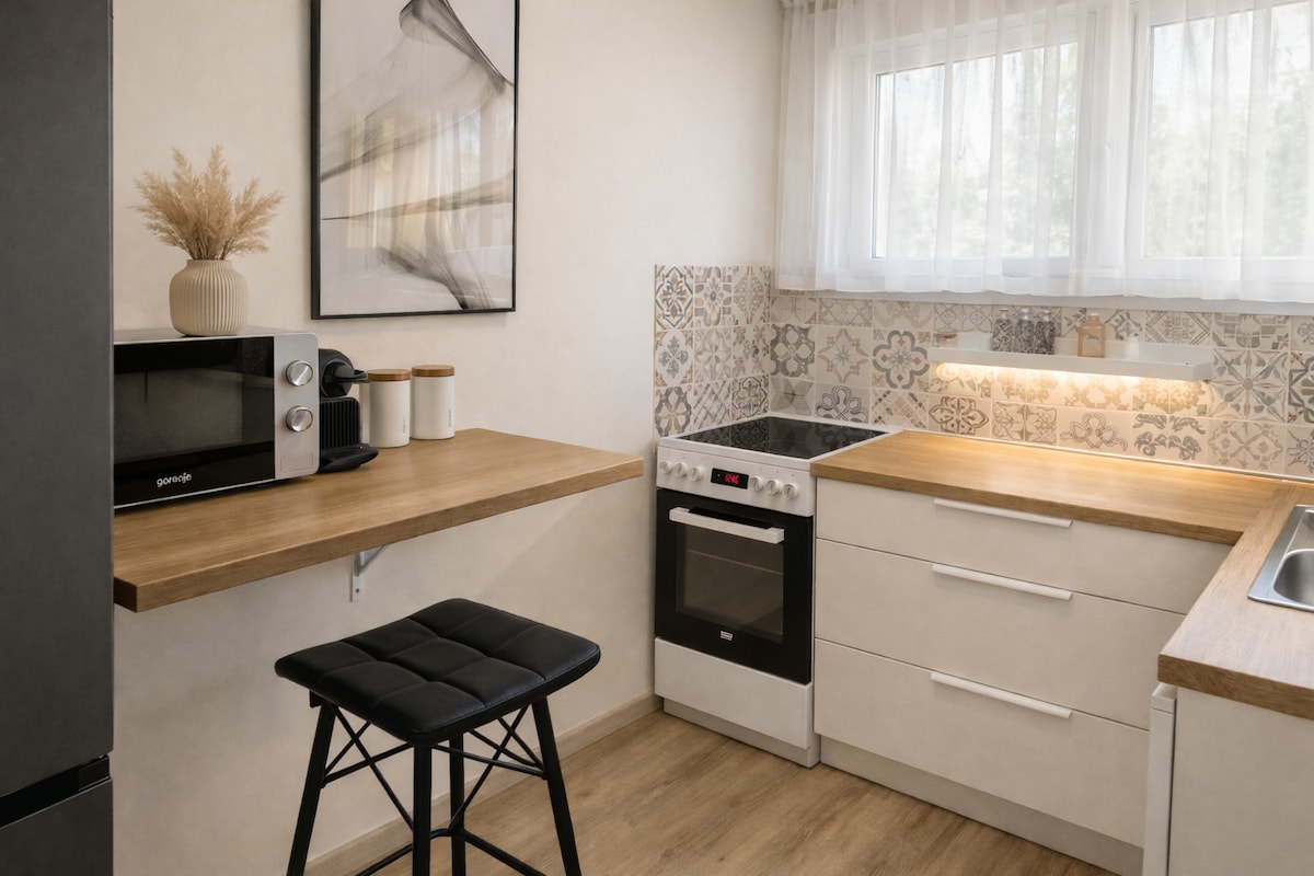 Utforska den historiska stadskärnan i Székesfehérvár från denna eleganta, moderna lägenhet! Med sitt centrala läge är restauranger, konditorier, barer och landmärken, parker som Zichyliget, Crown Park eller båtsjön några minuters promenad bort. Den bekväma resårmadrassen ger den perfekta vila, och det fullt utrustade köket är perfekt för en snabb frukost eller middag. Perfekt för både sightseeing och avkoppling!