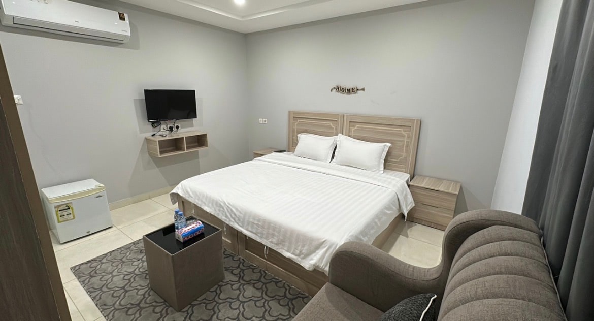 Modern inredning familjelägenhet perfekt för en mysig och lugn vistelse • Kingsize-sängen är rymlig och bekväm. • Elegant lounge med en praktisk session. • Modernt badrum med lyxig finish. • Distinkt luftkonditionering och belysning för större komfort. 🌟 Ett idealiskt val för besökare som söker komfort för arbete eller fritid
