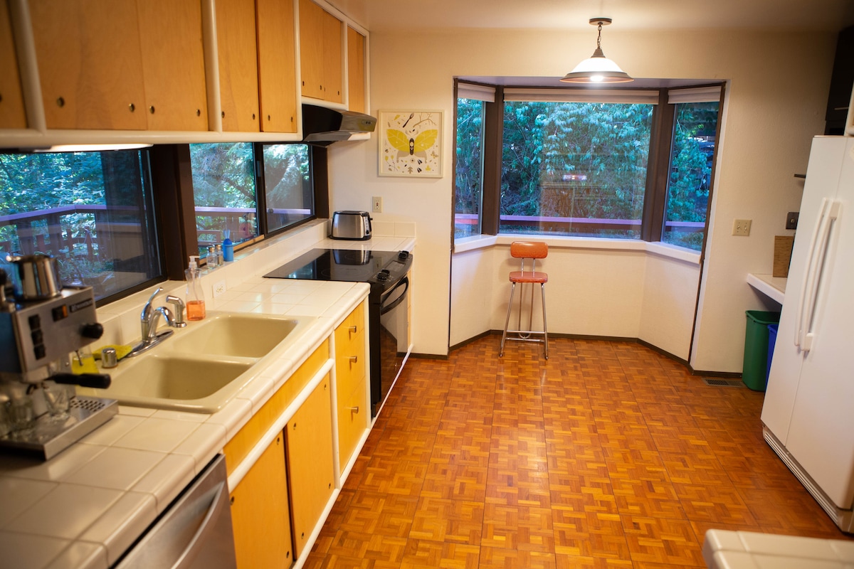 Mid Century Modern inspirerad oas med utsikt över skogiga Kobayashi Park och Chambers Creek – väl använt på sommaren. Detta boende är designat av den berömda Tacoma-arkitekten Russell Garrison och har en originell charm med fönster från golv till tak och en stor veranda som går runt hela huset. Beläget två miles från Chambers Bay och golfbanan som var värd för 2015 års U.S. Open. Utforska Mount Rainier, Olympic National Park och allt Seattle/Tacoma har att erbjuda. Värdar bor intill och är tillgängliga för att svara på frågor.