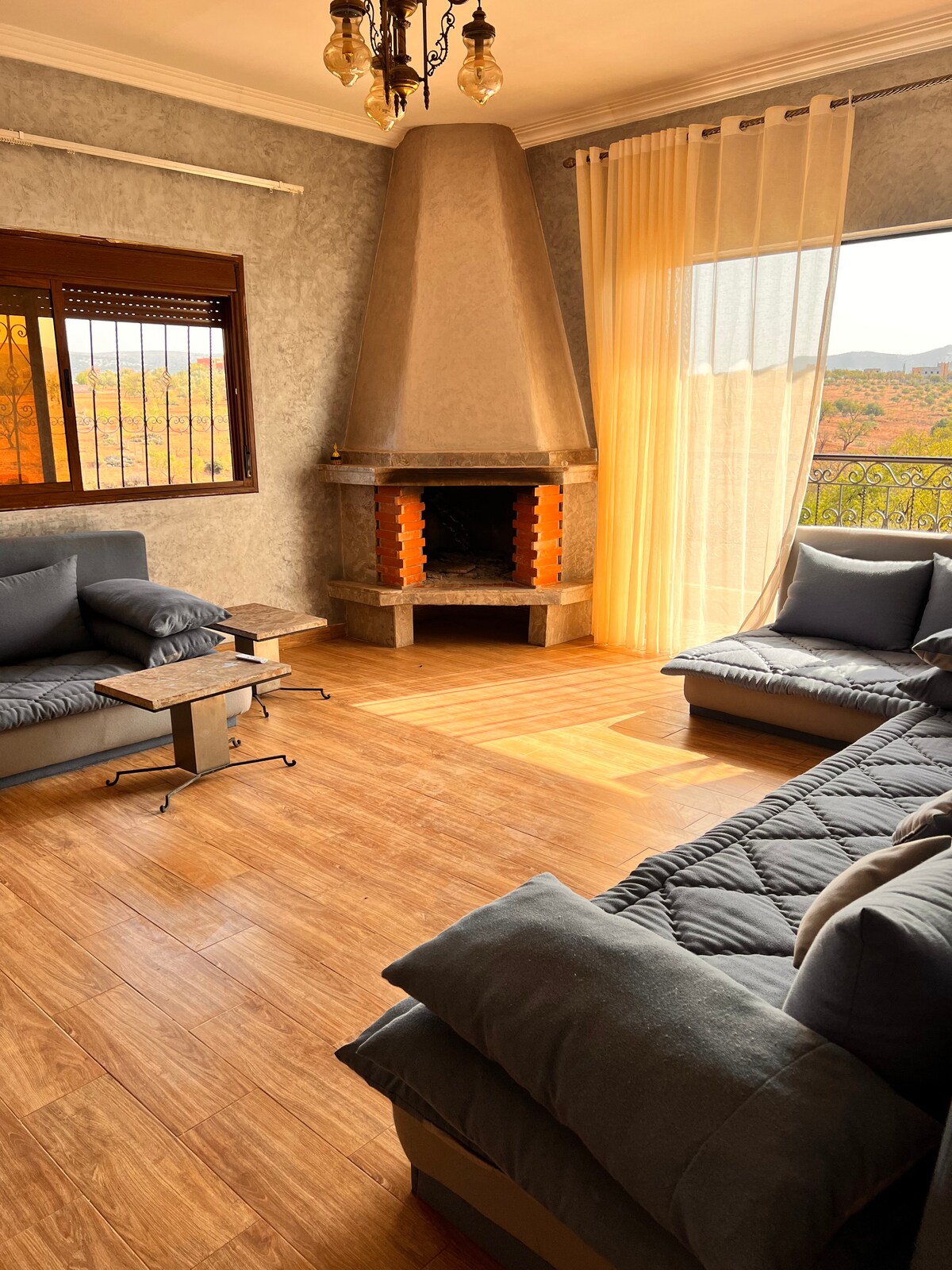 Landsbygdsvilla i en lugn och fridfull by, där du kan koppla bort från stadens värld. Njut av utomhusområden, fräscha upp vid poolen med fantastisk utsikt över bergen, eller värma upp vid en öppen spis. Villan ligger bara några minuter från Ouzoud vattenfall och bara några minuter från källan till vattenfallen, där du kan njuta av ett glas te punkterat av ljudet av floden .