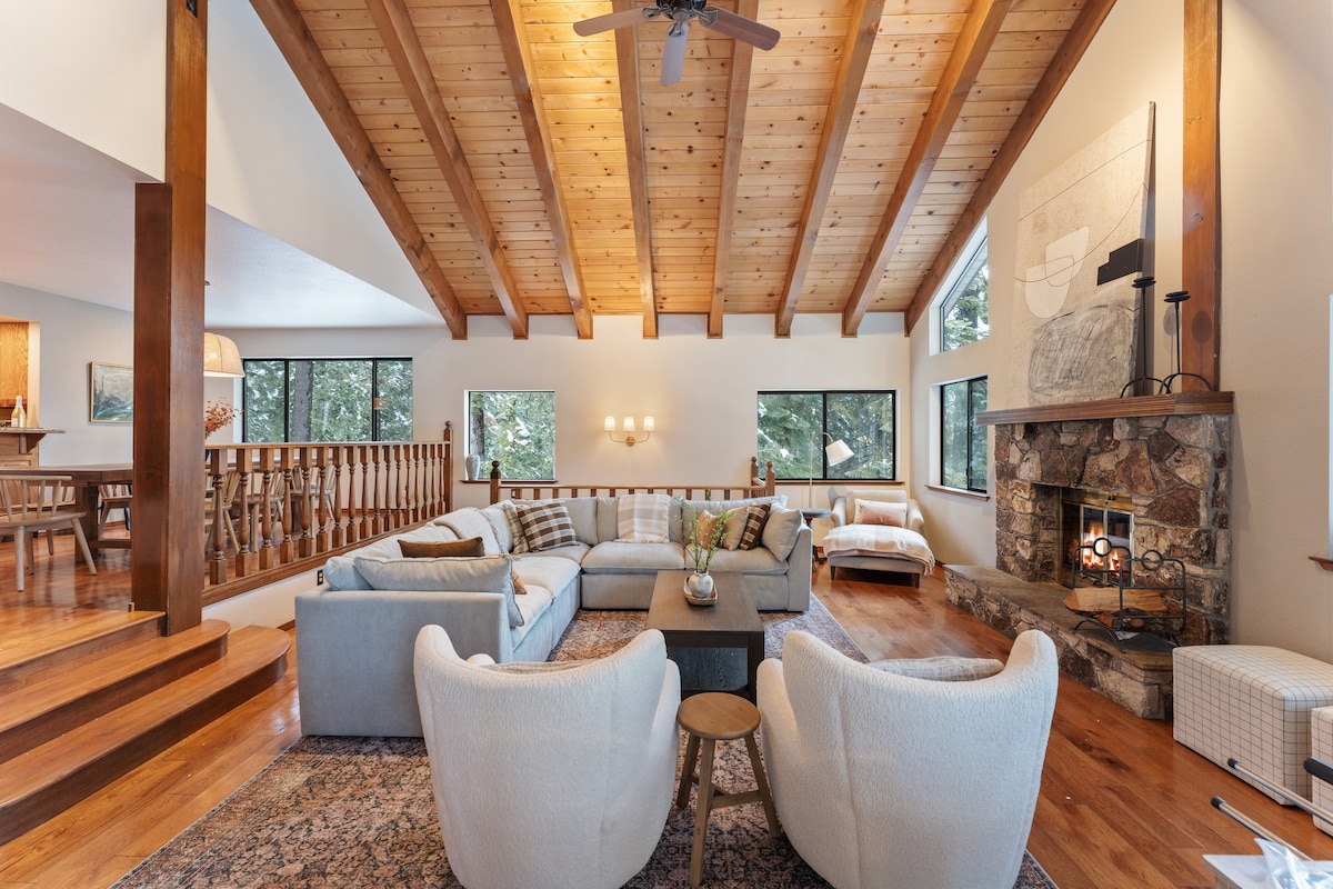 Modern Mountain Retreat är ett 2900 kvm stort 2-våningshus, sjö- och bergsutsikt från hus, altan, trädgård. *Priset inkluderar skatt. 4 sovrum, 4 badrum, 2 vardagsrum, 2 kök, 2 matsalar, 3 eldstäder (vedeldning + 2 gas), torr bastu, inomhus jet badkar, fullt möblerad, centralvärme, 2 tvättmaskin/torktumlare uppsättningar, diskmaskin, gasolgrill. 400 Mbps WiFi. 3 HDTV Roku, AppleTV, Directv. Nära Palisades, Homewood skidorter. Privat HOA-strand 5 minuters bilresa. Närliggande leder snöskor, x land, vandring, cykling.