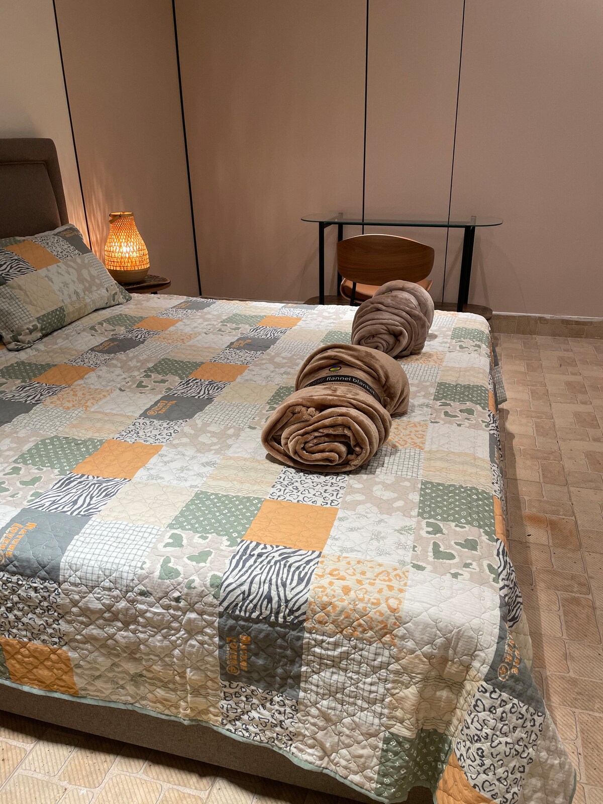Håll dig lugn och koppla av med din familj på detta tysta ställe. Bort från stadens buller och njuta av den underbara atmosfären i denna tvårum, två sovrum master och rum med två sängar, ett palats, ett kafé, grönområden på yttergården, en utomhussession, en pool helt täckt med glas, samt sandiga barnleksaker, samt några hotelltjänster som pasta, tandborstar, schampo och tvål, cirka 15 minuter från parken