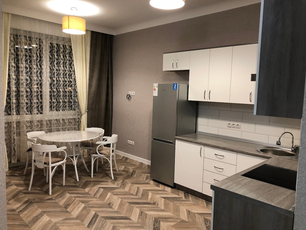 Lamiya bostadsområde, business class hus, 3-rum studio, Loft stil, 5:e våningen av 12, 2 sovrum, 2 badrum. Lägenheten rymmer 4 personer (par, 5 personer). Lägenheten har också ett smart lås, smart TV, 2 luftkonditioneringsapparater, 1 fläkt, diskmaskin, i allmänhet finns allt för en bekväm vistelse. Det finns en parkeringsplats, lekplats i närheten. Bostadskomplexet har en Magnum livsmedelsbutik, 5 kaféer samt ett INVICTUS GO-gym. Bostadsområdet ligger nära den centrala stadion, cirkus, teater, Baikonur tunnelbanestation