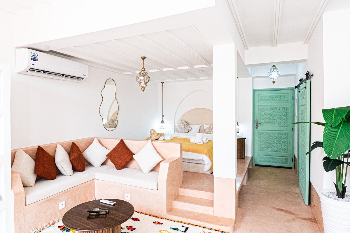 Lyxlägenhet i en vacker villa, med en välskött trädgård och privat pool. - Du kommer att vara ensam om att njuta av poolen (utan insyn) och lägenheten i källaren, ingen annan person i resten av villan - Utmärkt läge 5 minuter från motorvägarna. - Mindre än 25 minuter från Gueliz och mindre än 30 minuter från Jamae el Fena-torget - Det är inte tillåtet att ta emot personer som inte är registrerade.
