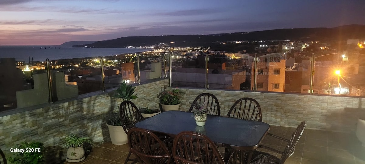 Luxurious penthouse with panoramic views of the Atlantic Ocean in the heart of Taghazout. Unique and sophisticated house, with attention to detail, from fine materials to designer furniture. The house has 4 bedrooms, two with double beds, one with en suite bathroom, a bedroom with two single beds and a spacious single room. Large living room with windows overlooking the ocean, an equipped kitchen overlooking the sea and a terrace with sofas, dining table and Barbeque. Hotel service on request.
