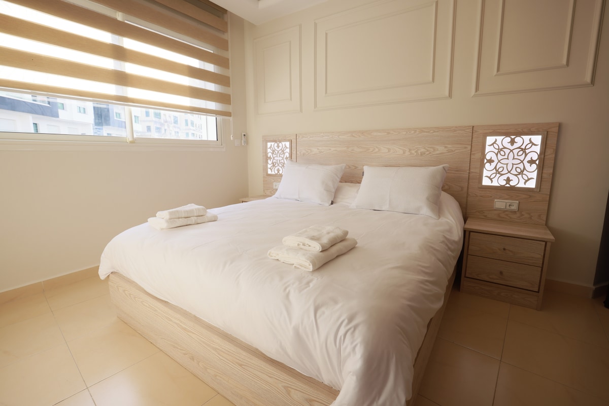 Lägenheten är av hög stående, belägen i centrum av Tanger med en vacker havsutsikt från balkongen och de två sovrummen. Säker privat parkering finns i tornet. Beläget 300 meter från stranden och 300 meter från TGV-stationen. Tornet omges av de mest kända 5-stjärniga hotellen som Hilton, Royal Tulip , med tillgång till spa och pooler . Det berömda Grand City Mall of Tangier ligger 500 meter från boendet . Lyxiga kaféer och restauranger i närheten.