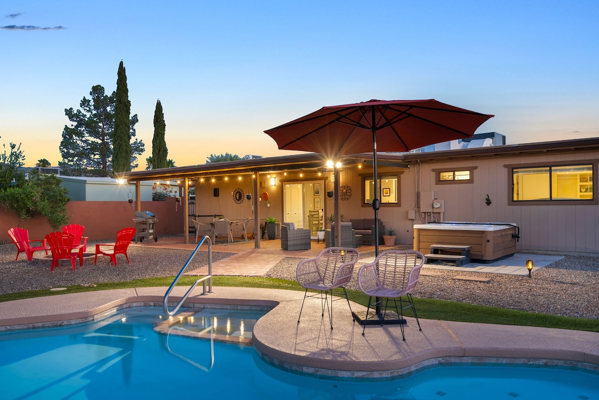 Fly värmen med vår smaragdpool! Håll dig varm med vår eldstad! Den nordöstra sidan av Tucson är det grönaste landskapet runt staden. Du kommer att vakna på morgonen välkomnad av Catalina Mountain utsikt och avsluta dagen med en fantastisk solnedgång som målar dem orange. Det nyrenoverade 1 säng/1 badrum gästhus (studio) ligger i ett lugnt grannskap, 15 minuter från vackra Saguaro National Park, mindre än en timme från Mt lemmon och massor av vandring, 30 minuter från centrum och flygplatsen.