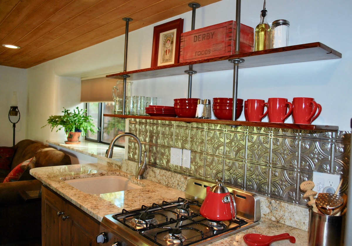 Nans fridfulla, säkra och bekväma Casita ligger på en återvändsgränd med Pueblo Peak i bakgrunden; stor, täckt uteplats/bord/stolar/kolgrill/utsikt över solnedgången och stjärnorna. Ombyggt litet hus med färgstark, konstnärlig inredning. Fullt utrustat kök/vardagsrum med luftkonditionering/värme/snabbt wifi/TV; mysigt sovrum/dubbelsäng/lakan i egyptisk bomull/stor TV/streamingkanaler; nytt soligt badrum. Tio minuter till Taos Plaza, tre minuter till TSV-vägen, nära till fantastiska restauranger/kaféer/lokaler med livemusik/vandring – perfekt för arbete/lek/vila/tillflykt.
