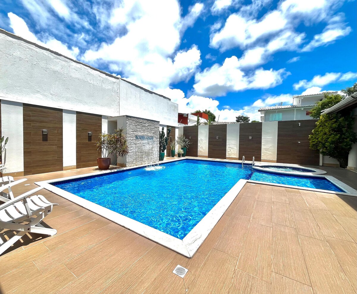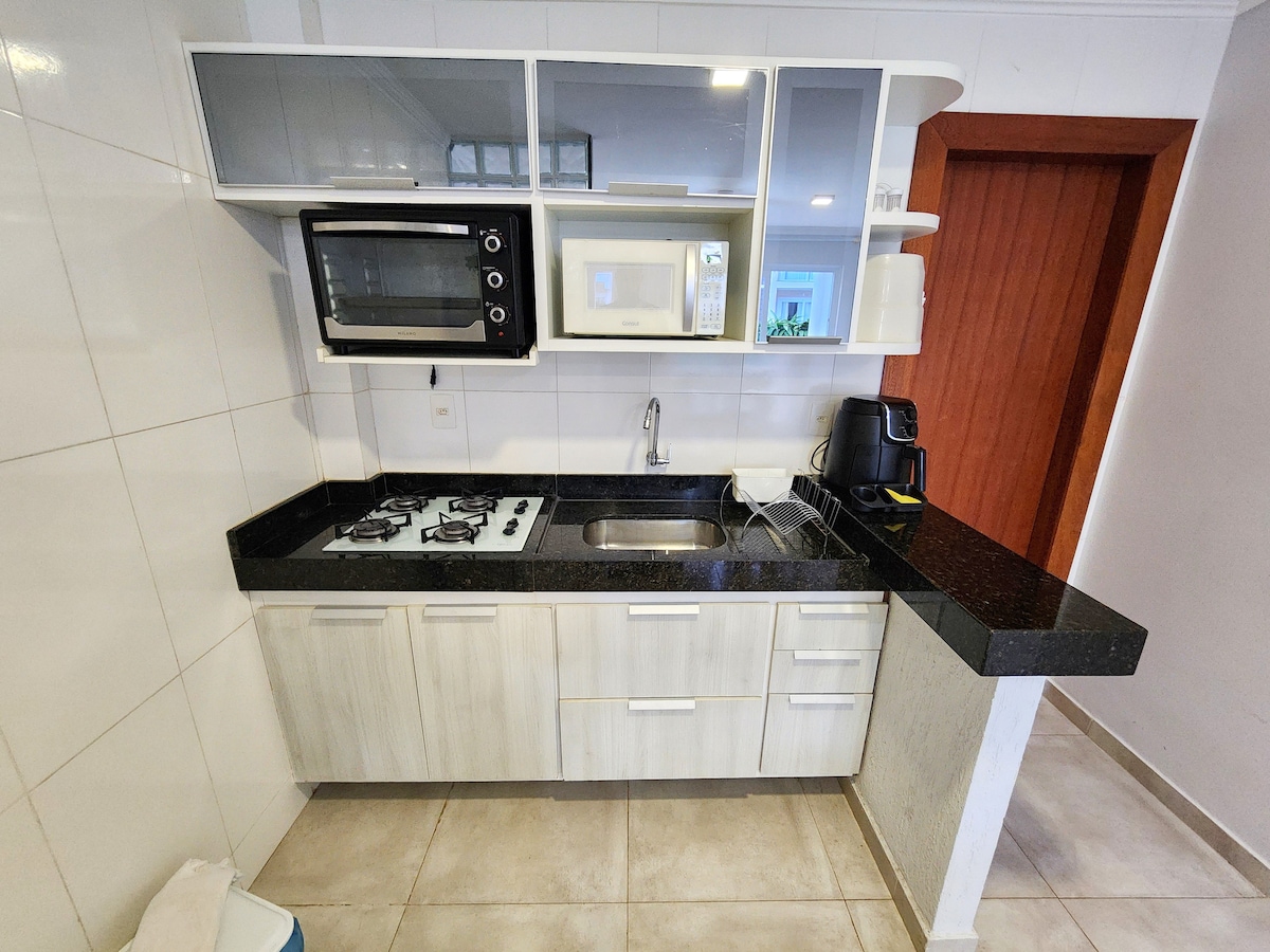 Njut av Arraial d’Ajuda i ett helt hus för upp till 4 personer, i ett säkrat område med bevakning dygnet runt. En luftkonditionerad svit, 55-tums smart-TV, snabbt Wi-Fi, fullt utrustat kök och balkong med utsikt över poolen. Fritidsområde med pooler för vuxna och barn, gemensam grill, bastu, fullt utrustat gym och gratis privat parkering. Komfort, praktiskhet och utmärkt läge för att koppla av, njuta och få ut mesta möjliga av regionen.