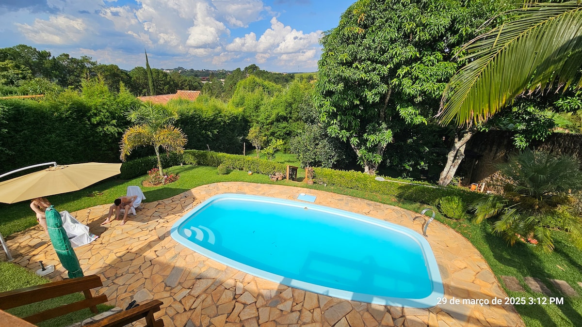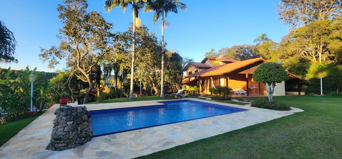 Venha criar memórias inesquecíveis com a família e amigos. Linda chácara! Casa principal com 4 suítes, área de tv, Wi-Fi, cozinha, sala de jantar, bar com mesa de sinuca, de jogos de cartas, churrasqueira segunda casa: 2 quartos e um banheiro. Piscina espaçosa, varandas, área verde de 8 mil metros, 2 lagos. Comporta 28 pessoas para dormir. Lar do Torrada, um dobermann muito dócil e simpático que ficará feliz em receber seus pets... Boa localização, 150m asfalto. Próximo ao comércio local