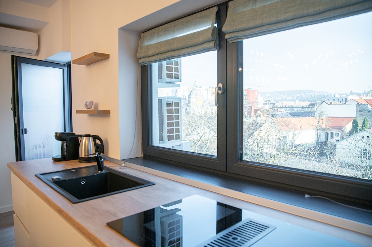 Apartamentul este compus dintr-un dormitor cu pat matrimonial și un living dotat cu canapea extensibilă. Oaspeții beneficiază de Smart TV cu Netflix inclus. Baia este echipată cu duș, iar bucătăria este complet utilată. În apartament veți mai găsi uscător de păr, fier de călcat și masă de călcat, precum și prosoape și lenjerie curate. De asemenea, sunt disponibile papuci de casă de unică folosință.. Apartamentul este situat la etajul 4 și este dotat cu aer condiționat.