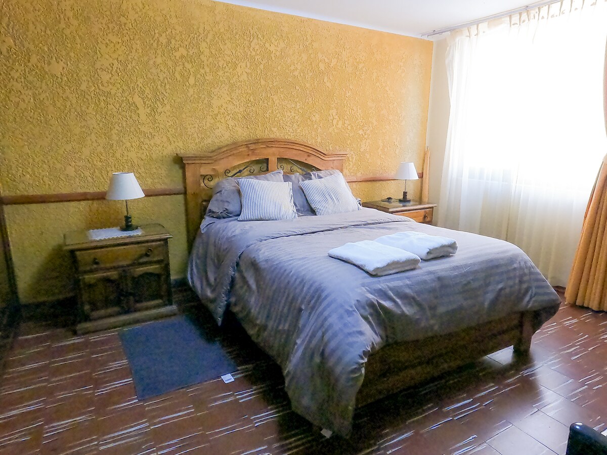 Välkommen till vår svit i det centrala området! Vår nyrenoverade lägenhet har två miljöer: ett kök och matsal, och ett sovrum med en dubbelsäng, med möjlighet att lägga till en madrass på golvet, den har också ett privat badrum och parkering. Vårt läge är perfekt, vi ligger 6 kvarter från Plaza Principal, bara 2 kvarter från en imponerande utsiktspunkt och 4 kvarter från den centrala marknaden. Vi hoppas att du kommer att njuta av din vistelse hos oss!
