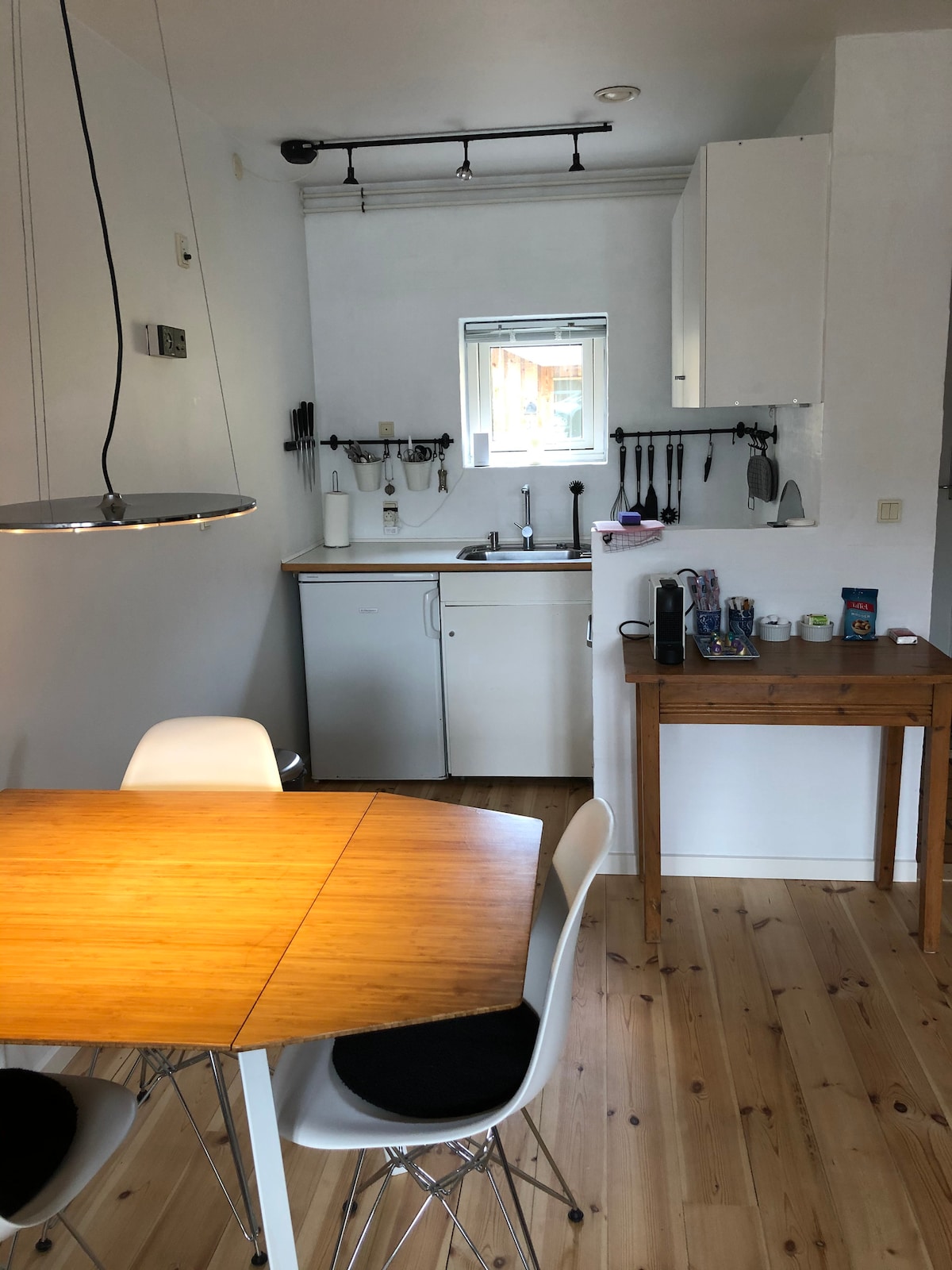 Här bryr vi oss mycket om städning. Trevligt ett rum annex på ca 20km2. Två dubbelsängar, de kan bäddas för två soffor. Liten mysig soffa. TV. Mindre kök för enkel matlagning. Miniugn, mikrovågsugn, kokkärl, kylskåp och köksgrejer. Täcken och kuddar med sängkläder. Badrum och mindre korridor för kläder och skor. Det är en romantisk varm dusch. Huset ligger precis på buss 35 till flygplatsen. Det ligger bara fem minuter från den idylliska fiskestaden med gamla gula hus och hamn. Fin strand och badhus.