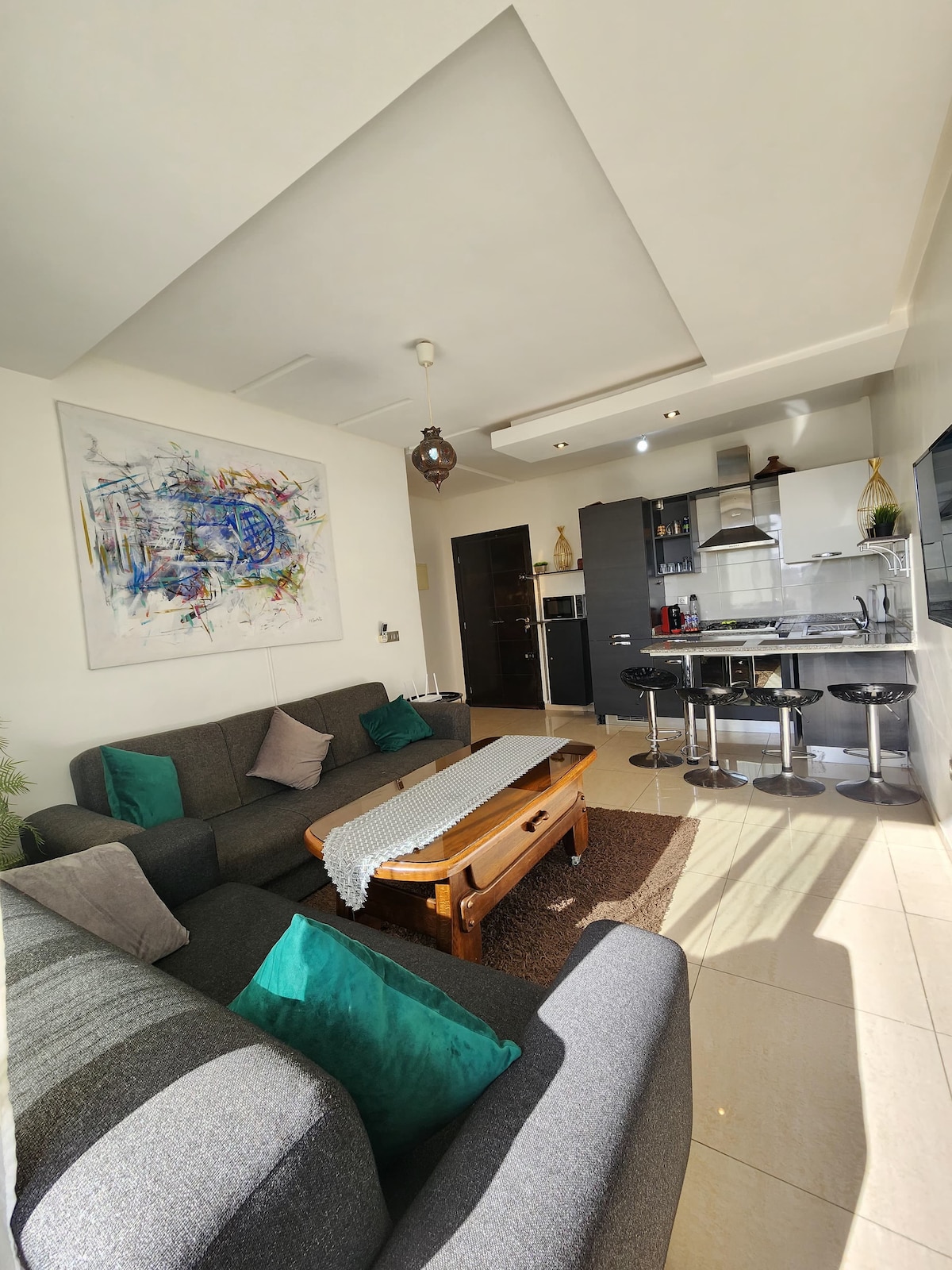 Mysig och solig lägenhet | Modern | 15 min Strand | Wifi | Netflix | 15 min Adrar Agadir Stadium Modern lägenhet i Agadir, belägen i ett säkert och livligt grannskap, nära stranden, restauranger och kaféer. Här finns två bekväma sovrum, ett ljust vardagsrum, ett utrustat kök och ett elegant badrum. Det perfekta stället för familjer eller ensamresenärer, som erbjuder en trevlig vistelse med enkel tillgång till lokala bekvämligheter. Njut av komforten och lugnet