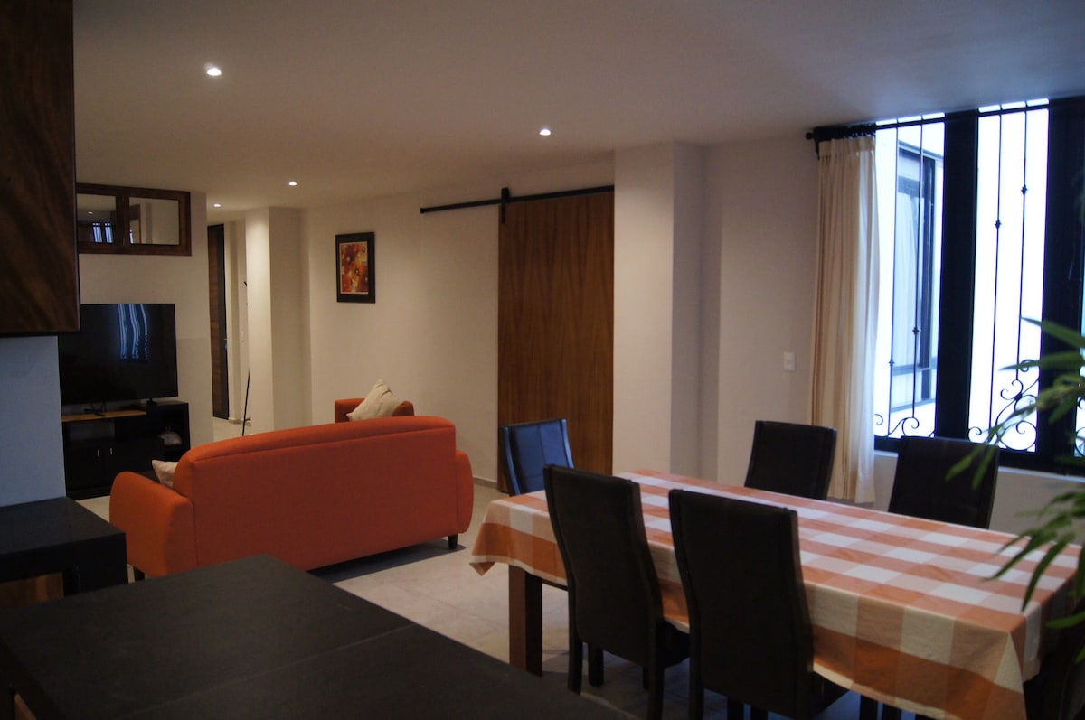 Lägenhet i kolonialstil med alla bekvämligheter, belägen i Taxcos historiska centrum. Bara några steg från två offentliga parkeringsplatser (ingår inte i kostnaden), Chavarrieta kyrka, San Bernardino de Sahagún kloster, ikoniska byggnader, kullerstensgator, museer, restauranger, hantverk och tjänster. En sju minuters promenad längs huvudgatan i den historiska kretsen tar dig till Santa Prisca kyrka och det centrala torget.