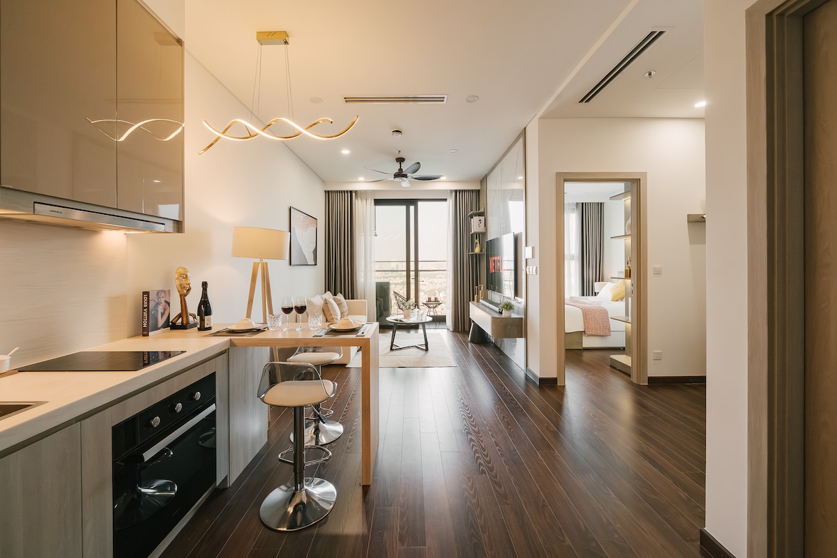 Välkommen till min lyxiga lägenhet Masteri West Heights — Beläget i livliga Vinhomes Smart City. Våra bekvämligheter: - Fullt utrustat kök med ett högkvalitativt vattenreningssystem där du kan dricka vatten direkt och laga härliga måltider. - Tvättstuga med tvättmaskin, torktumlare och tvättvätska. - Fullbordat badrum med TRESemmé schampo, balsam och duschtvål. - Gratis tillgång till intern buss, pool, gym, utomhus sportanläggningar, lekplats, etc.