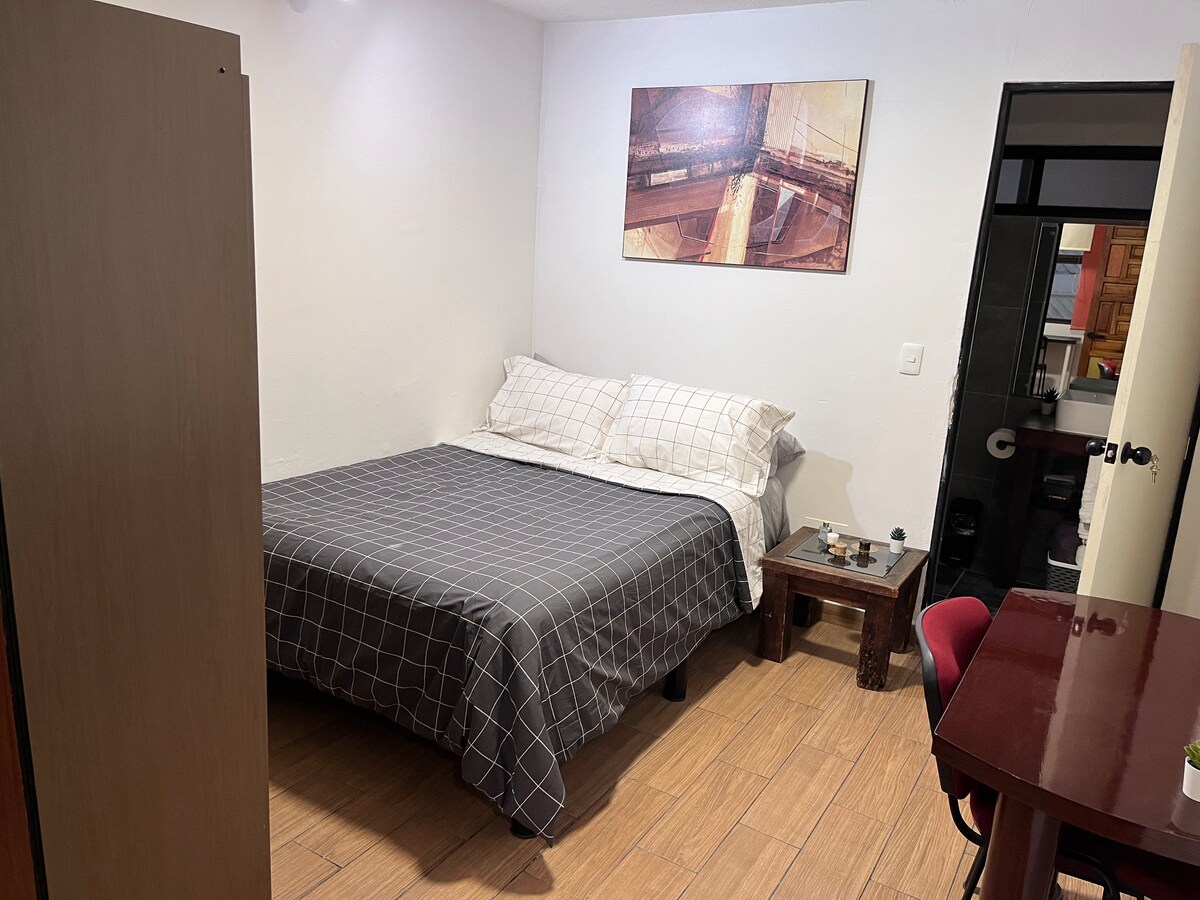 Njut av denna minilägenhet som vi har förberett för att du ska ha en bekväm och trevlig vistelse. Vi ligger nära Guadalupe-basilikan och tunnelbanestationen Indios Verdes. Minilägenheten är av loft-typ och ligger bredvid vårt familjehem, men det är ett helt oberoende utrymme så att du har integritet. Den har en queen-size säng, en bäddsoffa, ett komplett badrum och ett kök. Denna loftsvåning ligger på andra våningen, så du måste använda trappan för att komma upp.