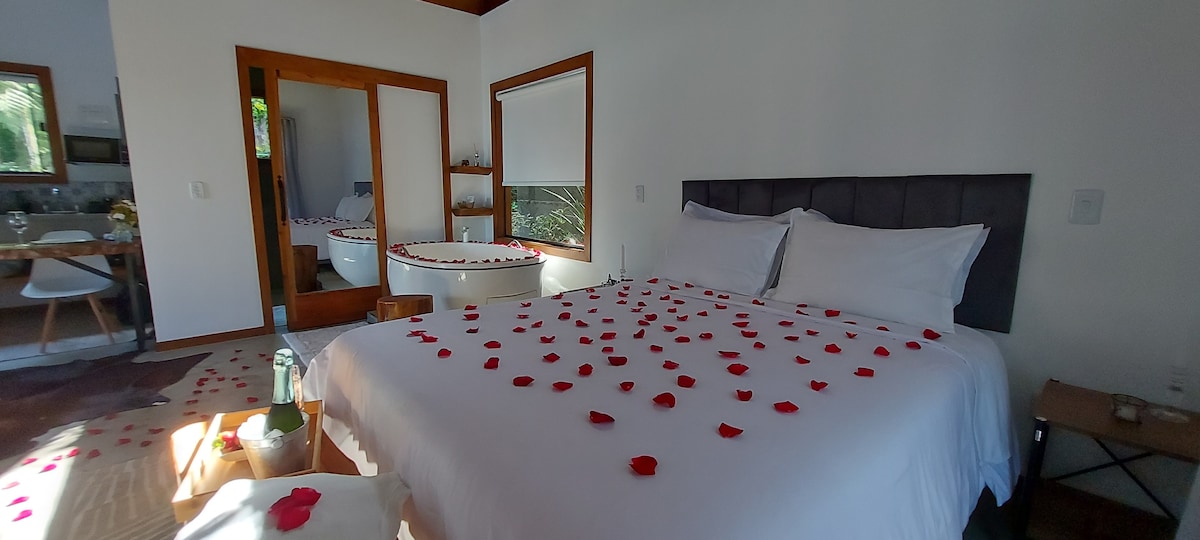 En superromantisk stuga i Araras, en av de mest charmiga tillflyktsorterna i Rio de Janeiros berg. Med badkar, pool, öppen spis, golvspis, grill, hängmatta... En liten bit av paradiset för dig att sakta ner, koppla av och förnya din energi. Omgiven av frodig natur, en hisnande utsikt och full av lugn. Stugan erbjuder mycket charm, elegans, komfort och imponerande arkitektur. Varje detalj har tänkts ut så att du kan få en unik upplevelse!
