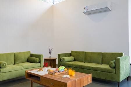 Tucked away in nature yet thoughtfully designed, this farmhouse with a private pool is a place that makes you slow down, breathe deeper, & truly enjoy the moment. Mornings begin with golden sunlight spilling into airy rooms, afternoons invite unhurried moments by the pool, & evenings unfold under a sky full of stars. Step into the heart of the home—a warm, inviting living space where plush green sofas & elegant wooden interiors set the tone for relaxed gatherings
