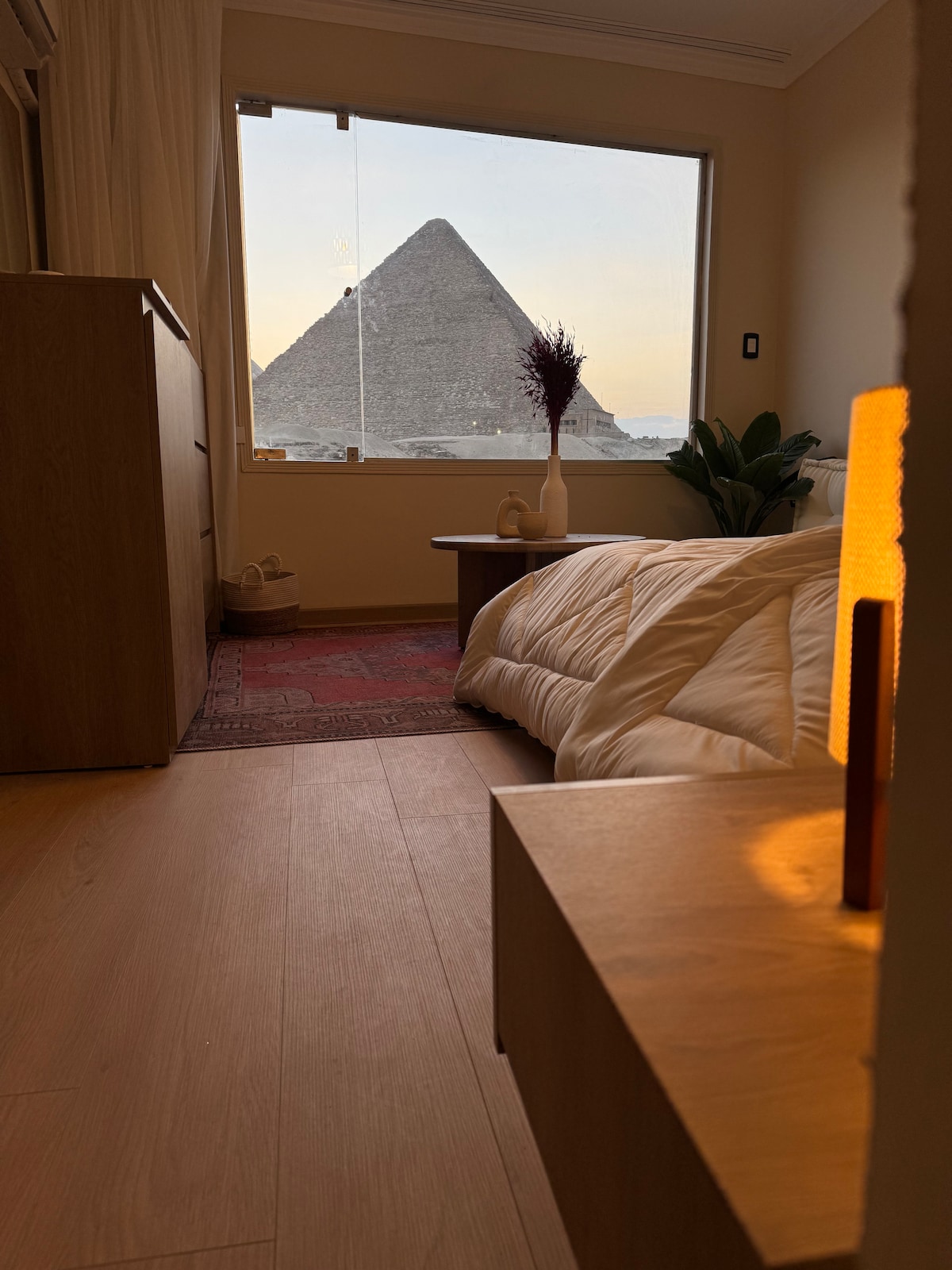 Koppla av i denna lyxiga takterrass med panoramautsikt över de stora pyramiderna. Njut av kunglig komfort i ett vackert inrett utrymme som blandar modern elegans och egyptisk charm. Bara 12 minuter från den nya Pyramid Gate och 10 minuter från Grand Egyptian Museum, det är perfekt beläget för upptäcktsresande. Det fullt utrustade köket och den expansiva terrassen gör det till en oförglömlig vistelse.