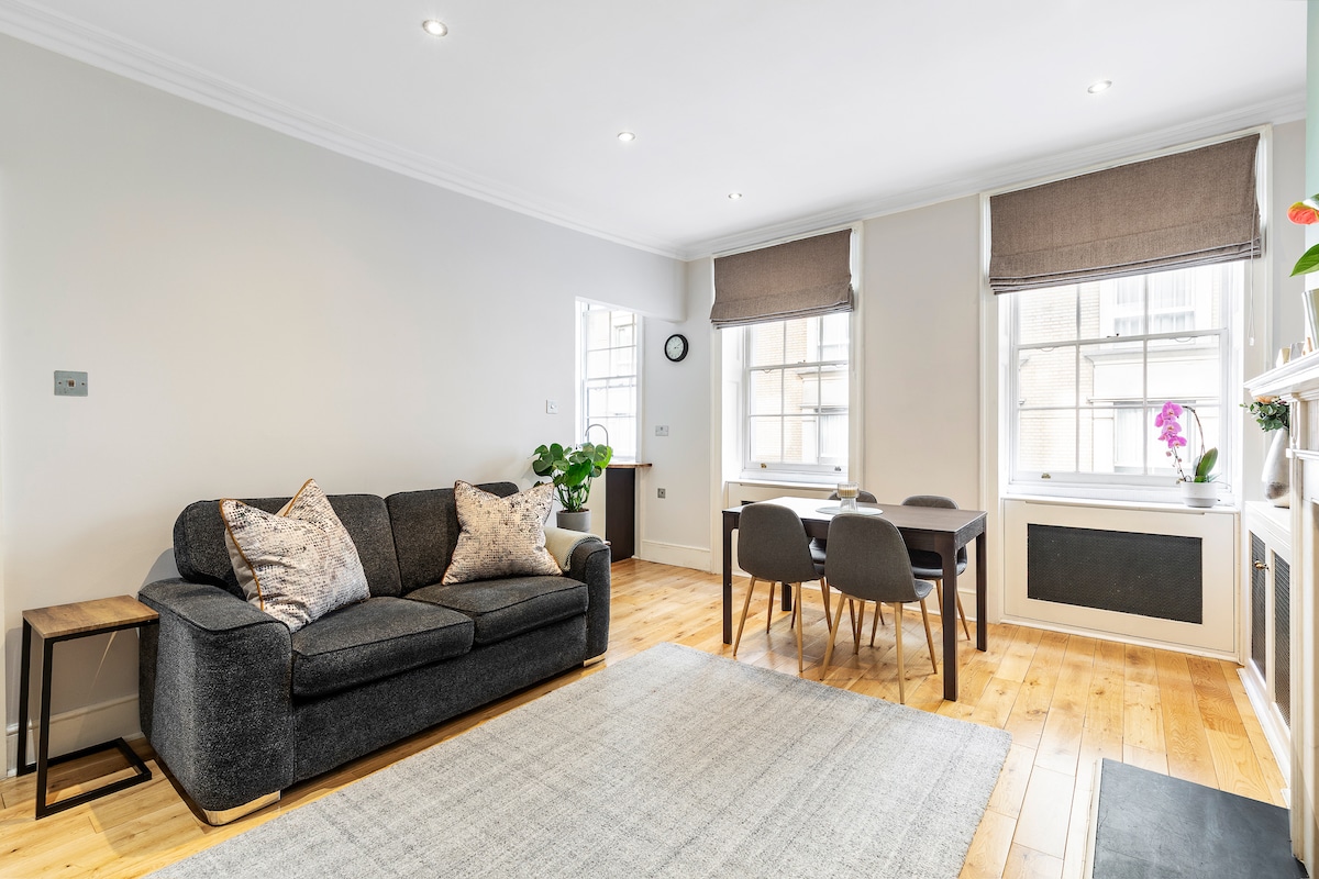 Mitt emot Buckingham Palace mitt i centrala London. En lyxig lägenhet med ett sovrum, i ett historiskt 1800-talets Grade II Listed townhouse. Ultra-prime St. James's Park läge, 10 minuters promenad från sevärdheter, t.ex. Parlamentet, Big Ben, Westminster Abbey, Belgravia & Mayfair. En lugn tillflykt. Noggrant inrett, fullt utrustat kök, lyxig inredning och concierge dygnet runt. Perfekt för barn, 1 sovrum med dubbelsäng och 1 bäddsoffa (i vardagsrummet eller sovrummet, ditt val).