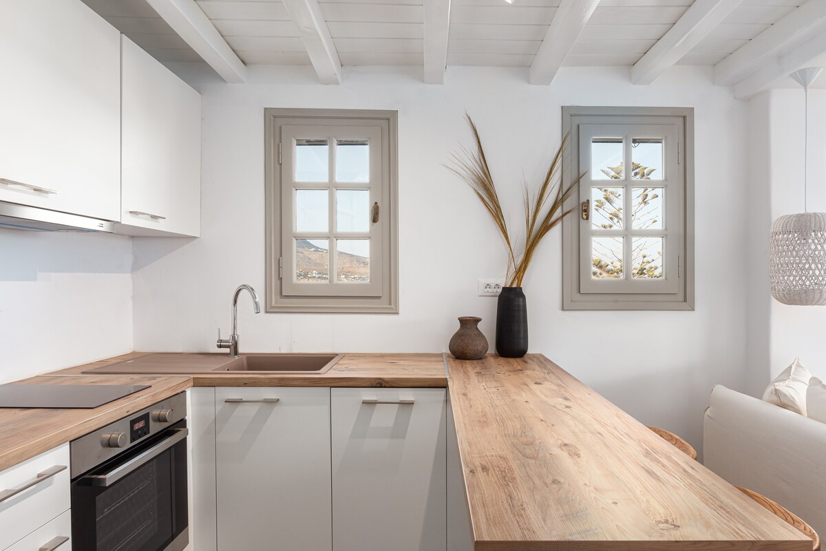 Our cozy bungalow sits just above Agios Sostis, It’s one of the rare beaches on the island that remains unorganized, no day clubs, no sunbeds and no umbrellas. The property is inside a gated estate with only 2 bungalows, a yoga space, and free on-site parking. A 15-minute path leads you down to the beach, and just above it you’ll find the famous Kiki’s Tavern—loved for its traditional Greek food and authentic charm. We’d love to welcome you and share this little corner of the island with you.