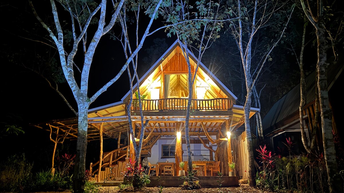 Upplev att leva utanför elnätet i regnskogen Bo i vårt mysiga lilla trähus, drivs av solenergi och omgiven av frodig natur. Njut av det fridfulla ljudet av en närliggande bäck och varva ner i ett lugnt utrymme där du verkligen kan sakta ner och återförenas med naturen. Vad du kommer att gilla: - En mysig trästuga omgiven av frodig regnskog - Öppna, luftiga utrymmen med hängmattor för ren avkoppling - En veranda för att njuta av ditt morgonkaffe med utsikt över djungeln